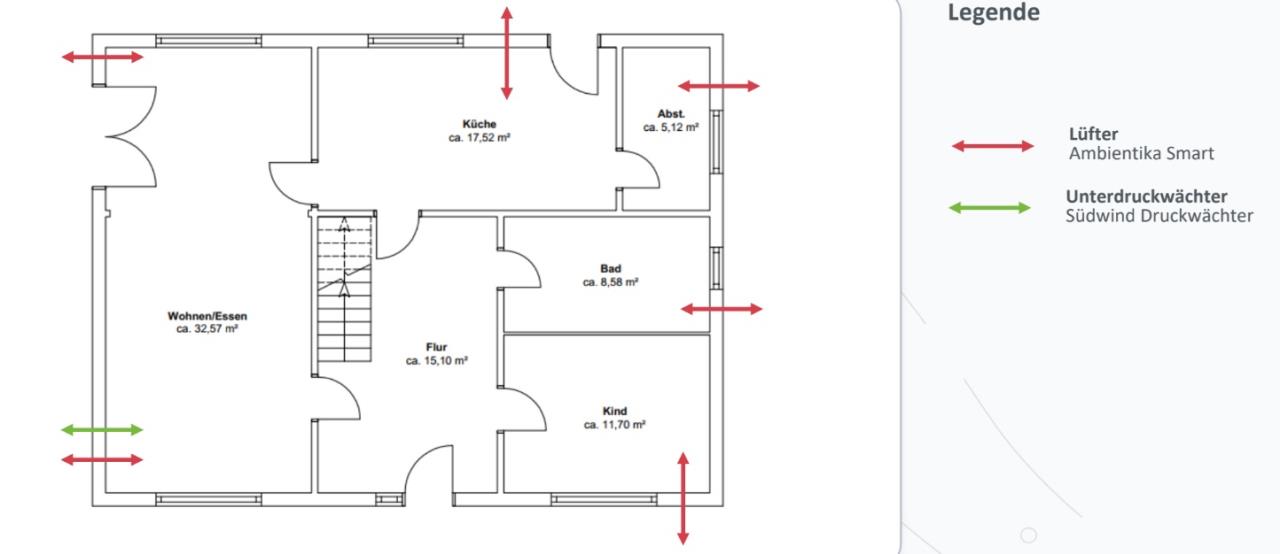 Das ist jetzt einfach mal ein Grundriss des Erdgeschosses mit eingezeichneten Stellen für Lüfter und Unterdruckwächter. Dazu gibt es noch ein OG. Luftbude hat eine Berechnung zu Luftwechsel, Luftinfiltration und zur Anzahl der min. benötigten Lüfter gemacht. Dazu gab es ein passendes Angebot und ein Beratungsgespräch mit dem Fachplaner. |