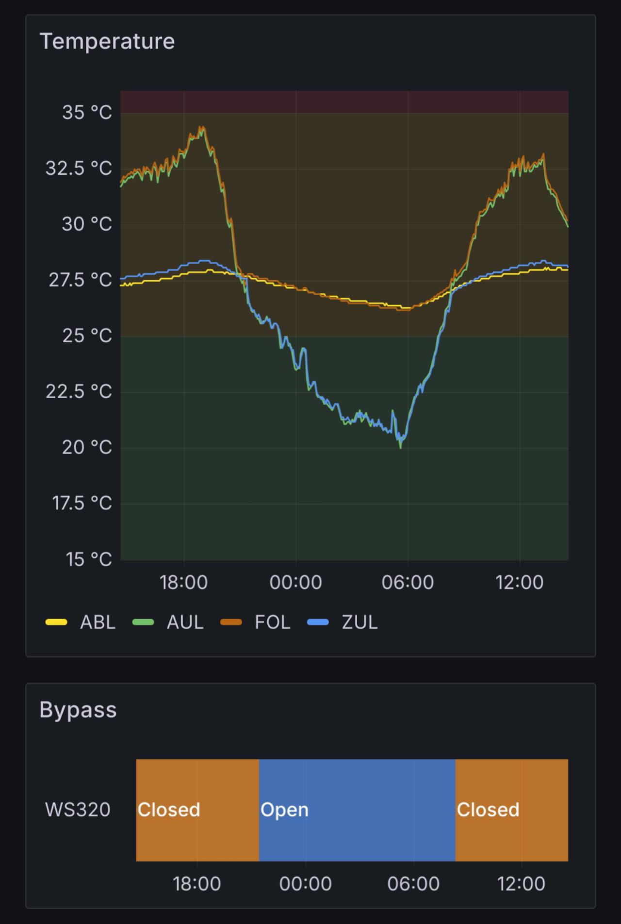 Das macht das Lüftungsgerät automatisch. Wenn die Außenluft näher an der Solltemperatur ist als die Innenluft, dann wird der Bypass aufgemacht, sonst bleibt er zu. Sieht man hier schön: Über Nacht ist der Bypass offen und die kühlere Luft kommt ins Haus. Sobald es draußen wärmer wird, macht er zu und der Wärmetauscher lässt die Wärme draußen.