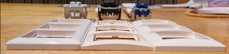 Links die S.1 Schalterabdeckung im Balance SI Rahmen, die Nasen zentrieren zwar den Rahmen die Abdeckung bleibt aber mit etwas Abstand. Mitte und Rechts, hier sieht man den originalen S.1 Rahmen mit den Ausnehmungen für die Nasen und der genauen Passform, hier sind Abdeckung und Rahmen an der Rückseite plan.
