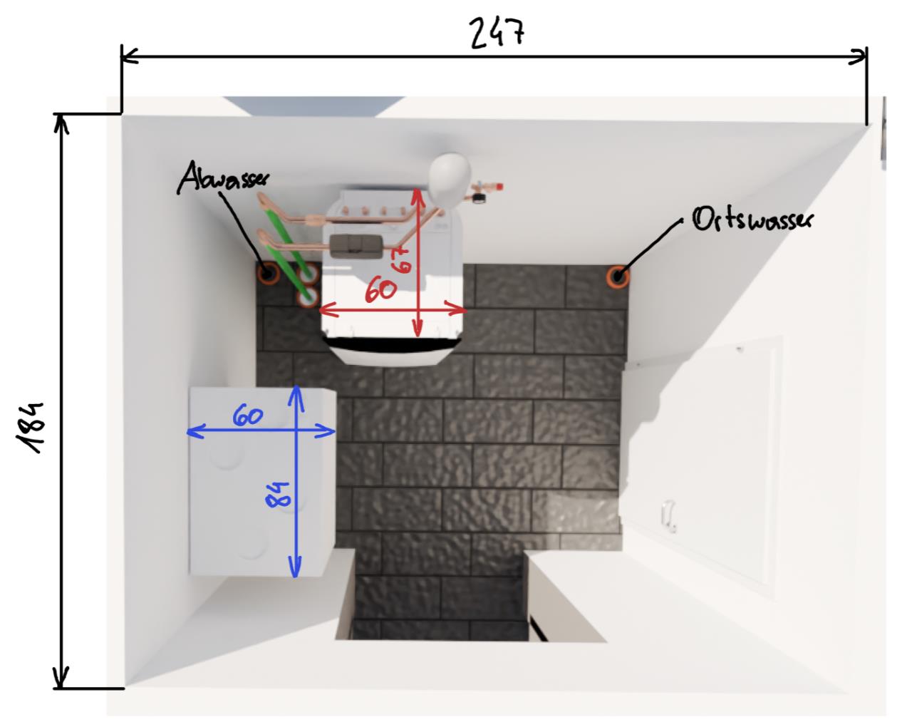 Würde dir beim Entscheiden schon helfen. Nur es fehlen Maße zur niesche und auch die der WP WP [Wärmepumpe] oder auch des Typs. Wo kommen andere Leitungen wie Heizung und Wasser her. Du solltest nur darauf achten es an alles zugänglich zu halten für spätere Wartungsarbeiten oder Reparaturen |