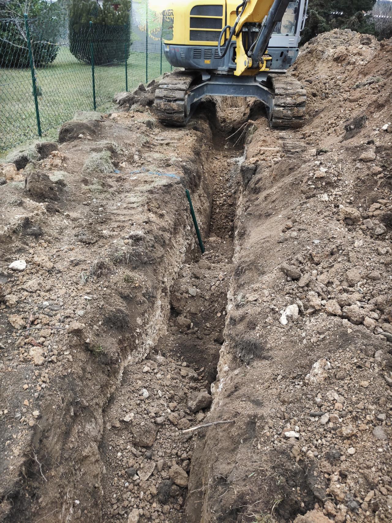 Nach fast drei Wochen ist der Graben jetzt endlich zum Großteil wieder verfüllt 😃 Die ersten 15 m am warmen Ende habe ich selber mit meinem Mikrobagger geschafft. Den Feiertagen und der Größe des Baggers wegen ist es dabei geblieben, bis der große Bagger aus dem Betriebsurlaub erwacht ist. Der hat sich dann nach einer halben Stunde zum dritten Mal in dem Projekt einen Schlauch gerissen. Nach der Reparatur ist es aber dann flott gegangen. Wir haben bis auf ungefähr 70 cm mit dem ausgehobenen Lehm verfüllt, dann das Warnband eingelegt und den Rest mit dem abgezogenen Humus aufgefüllt. Das Material schön langsam reinrutschen lassen, damit der Kollektor keinen Schaden nimmt. Den habe ich übrigens davor nochmal auf 2 bar abgedrückt, damit wir etwaige Probleme gleich mitbekommen hätten. Über der Schweißverbindung haben wir einen alten Zaunsteher mit eingegraben. Falls wir da jemals wieder hinmüssen (was ich mittlerweile nicht mehr glaube), finden wir sie so leichter. Wie von @rabaum empfohlen, habe ich den geraden Teil unter der Einfahrt noch mit einem längs aufgeschnittenen Rohr nachträglich isoliert. Schön ist es nicht geworden, aber es wird den Zweck hoffentlich erfüllen. Danke für den Tipp! In der Einfahrt werden wir komplett mit verdichtbarem Material auffüllen, damit wir die in absehbarer Zeit wieder als Einfahrt benutzen können. |
