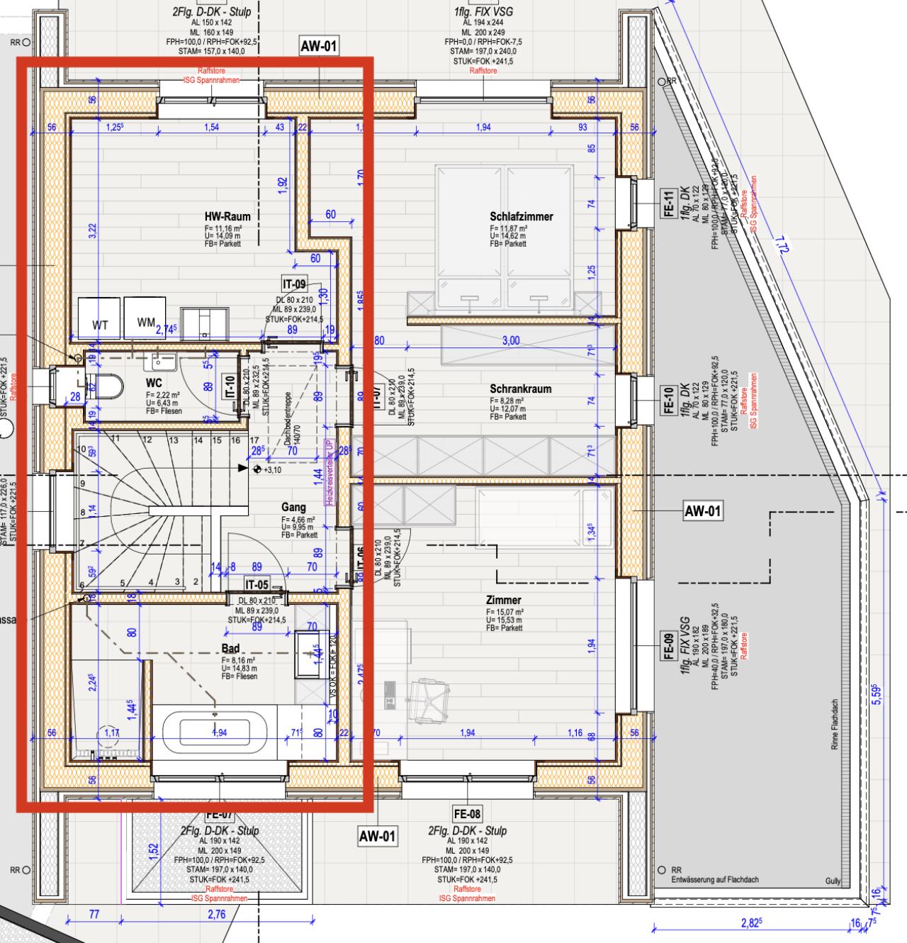 Hier unser Plan (der Bereich mit der Zwischendecke ist rot markiert), Schnitt und Aufbau: