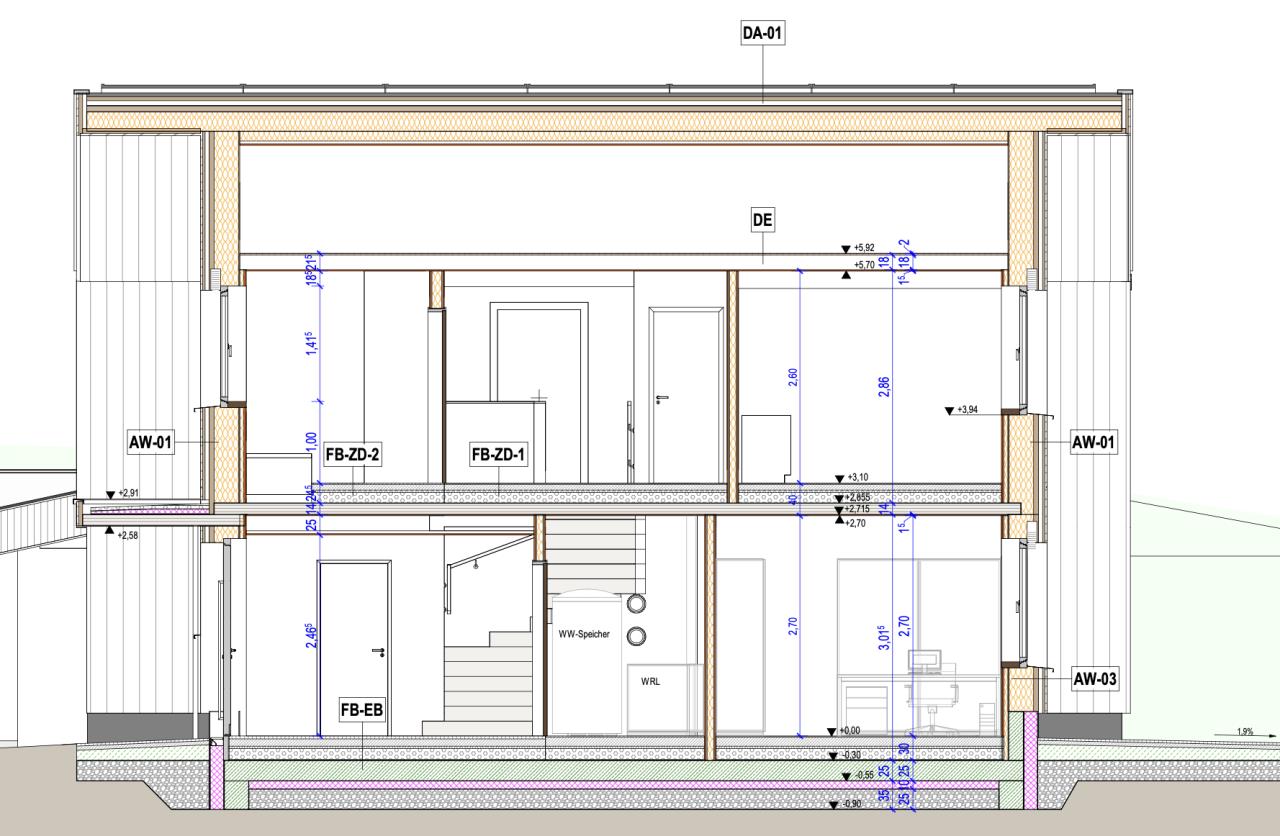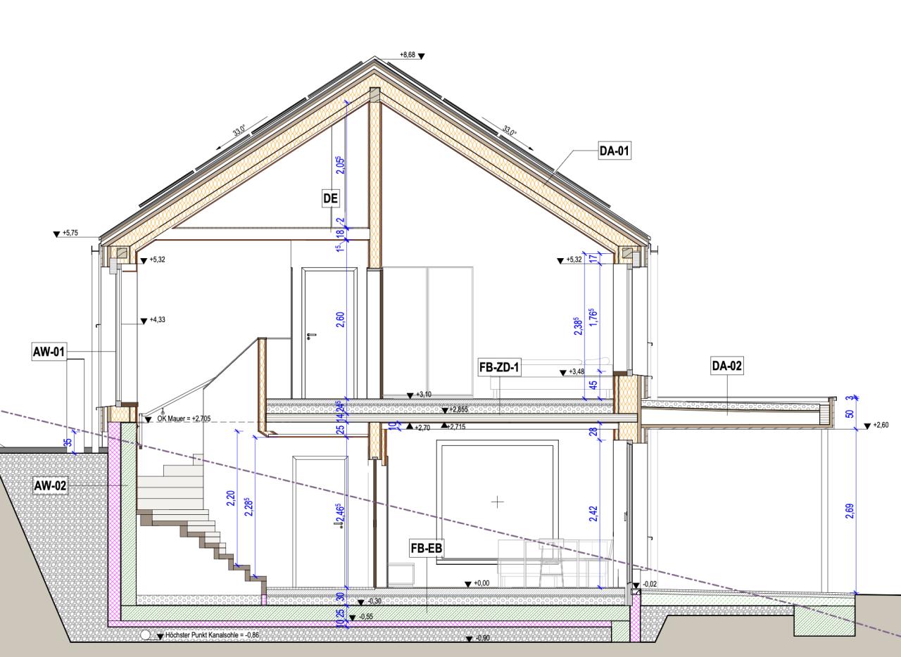 Wir bekommen ein Warmdach - auf einer Haushälfte sind die Zimmer im Obergeschoß nach oben hin zum Dachstuhl offen, auf der anderen Hälfte wird eine Zwischendecke eingezogen damit wir einen kleinen Dachboden haben. Momentan ist keine Dämmung in dieser Zwischendecke vorgesehen.
