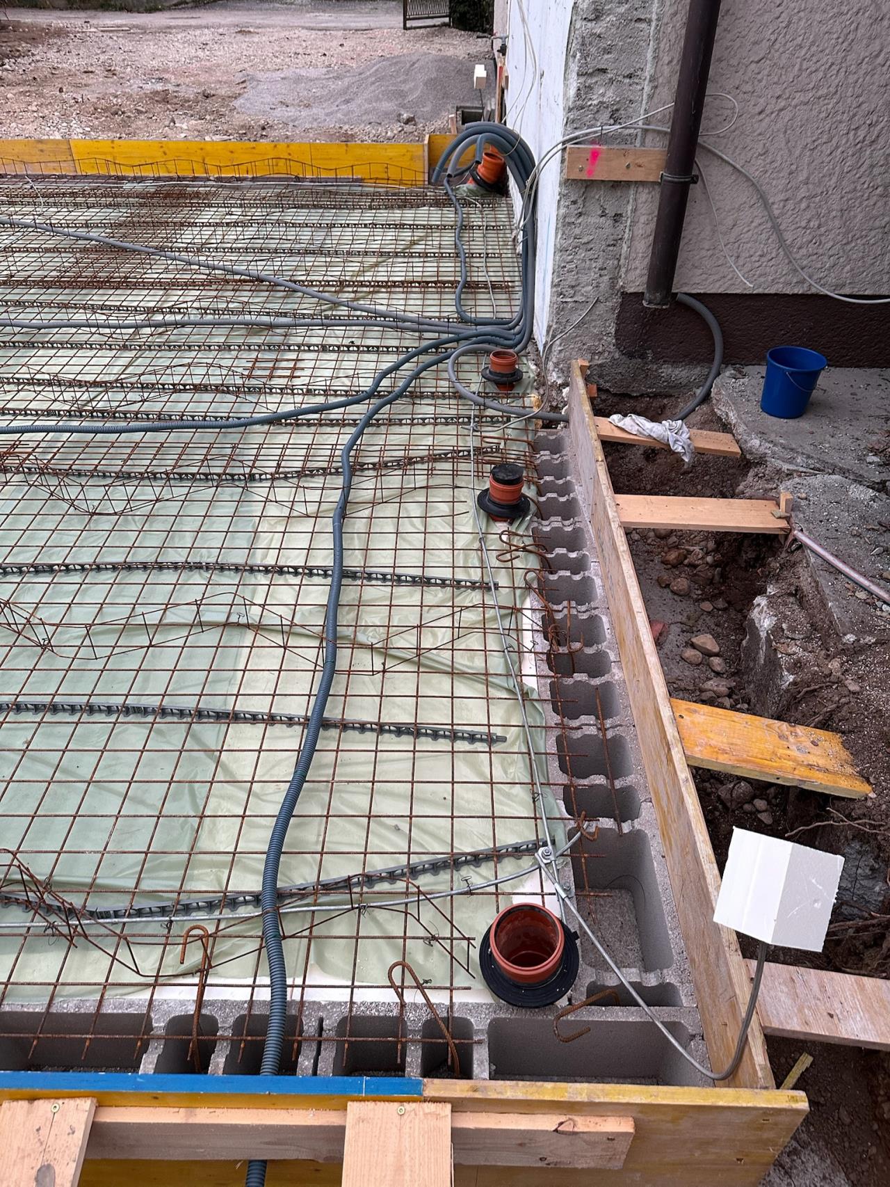 bei unseren bereits erstellen Zubau möchten wir die Bodenplatte heizen, ursprünglich hätten die Schläuche in die Betondecke kommen sollen, allerdings wurde das aufgrund einer Radondichten ausführung anders geplant, jetzt sollen wir die FBH FBH [Fußbodenheizung] direkt auf die Betondecke setzen (ohne Dämmung) und dann mit 8cm Estrich weitermachen. Bei durschauen der von mir gemachten Bildern ist mir allerdings aufgefallen das das XPS bei den Schalsteinen abschließt. Die Betondecke geht allerdings über diese hinaus bzw. wurden auch die Schaltsteine mit diesem Beton verfüllt. Außen wurde nur über die Betondecke gedämmt und nachträglich diese Dämmung angeschrägt, vorher kam noch ein 2K Abdichtung auf die Ziegel und Betonplatte.