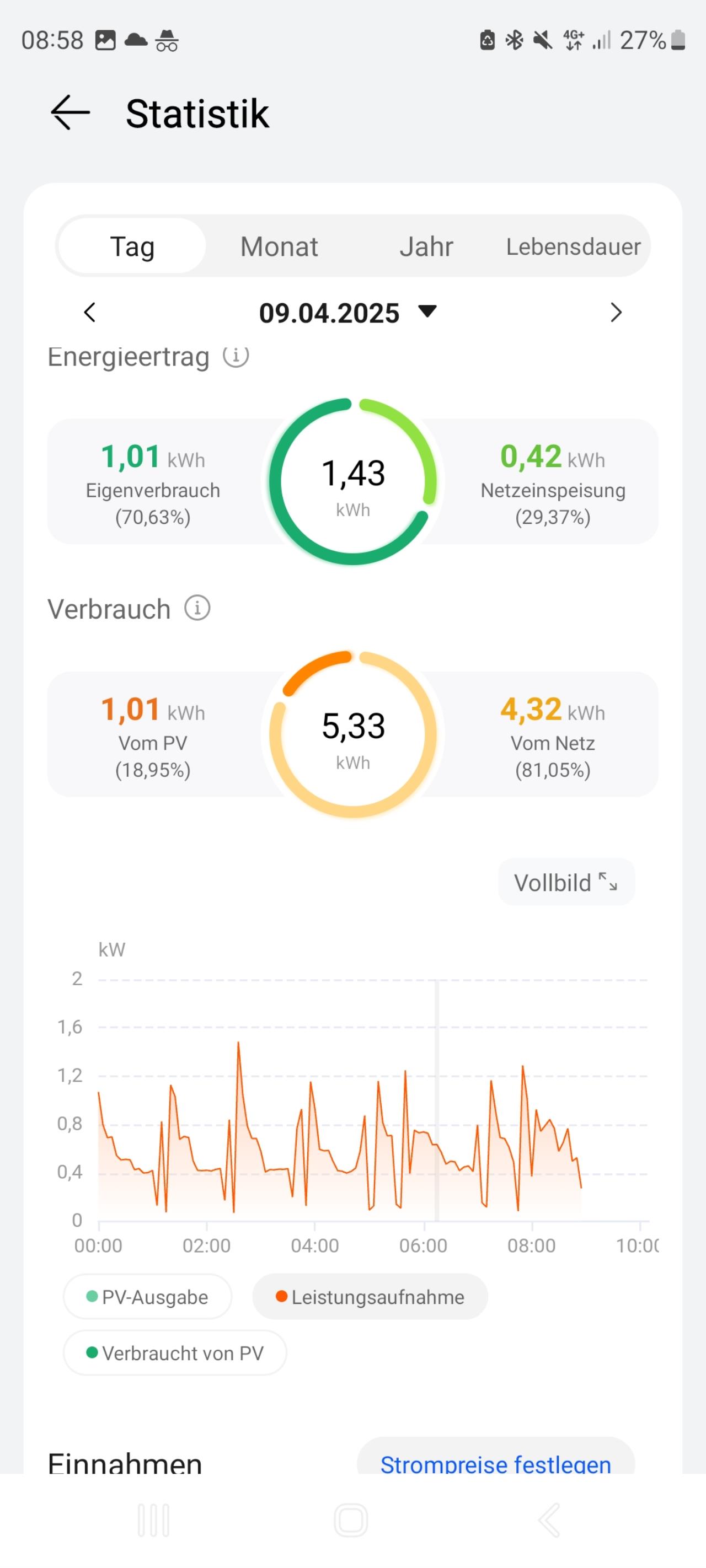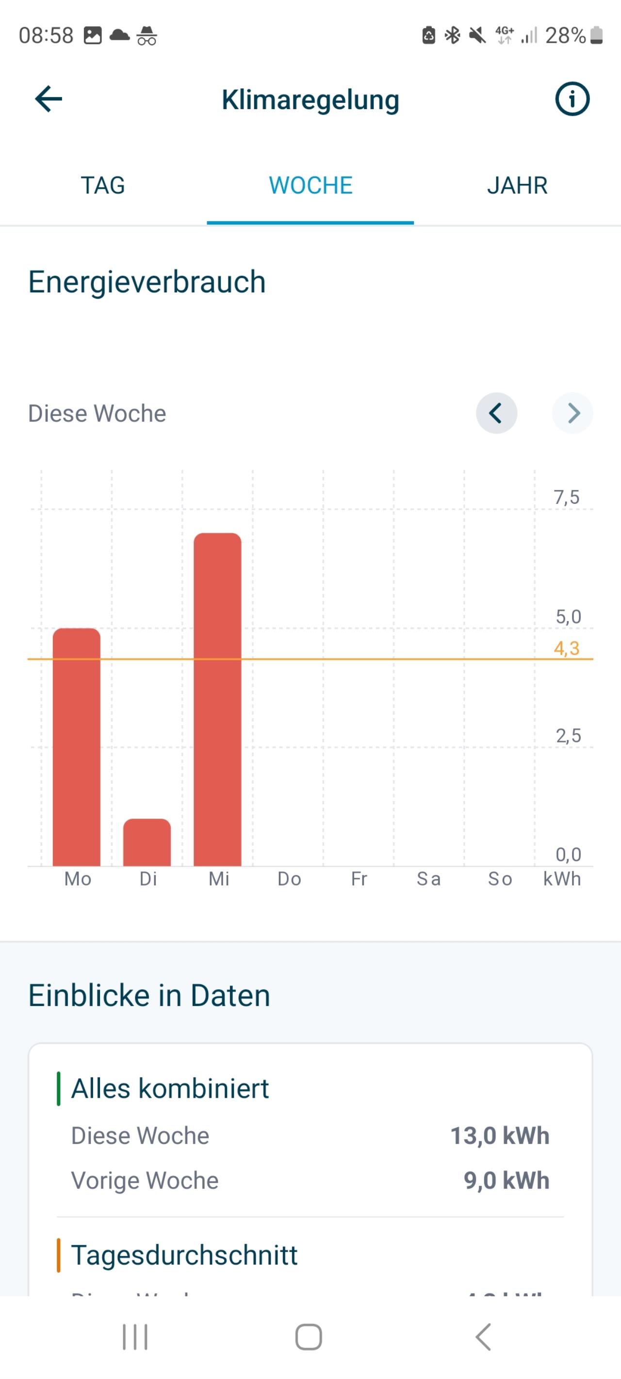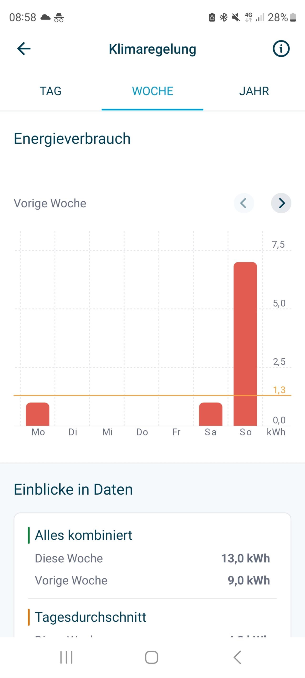 In der Daikin App kann man zwischen Warmwasserenergie und Heizungsenergie wechseln. Dein Screenshot zeigt Klimaregelung somit ist der Verbrauch nicht von der Herstellung des Warmwassers. Zeig mal die Einstellungen von der Heizung. Wie warm sind die Räume? |
