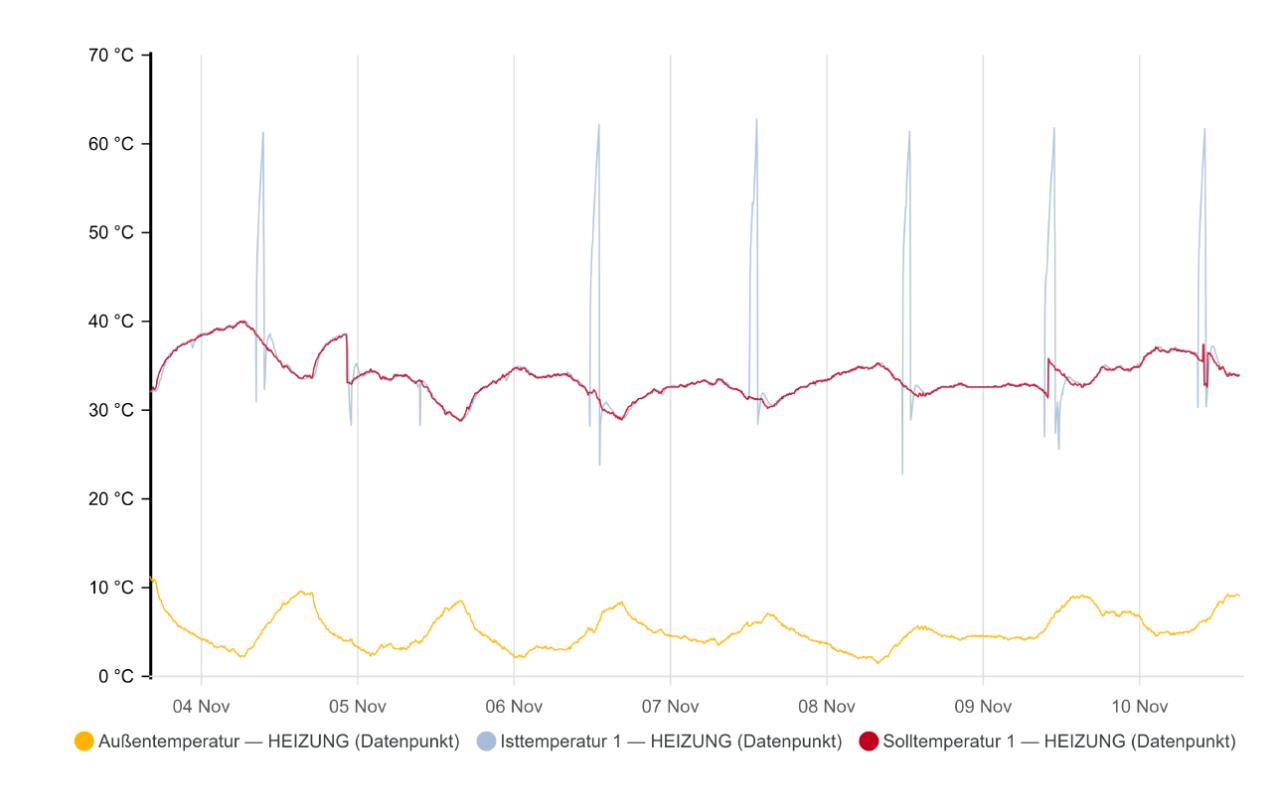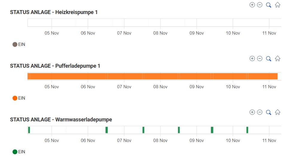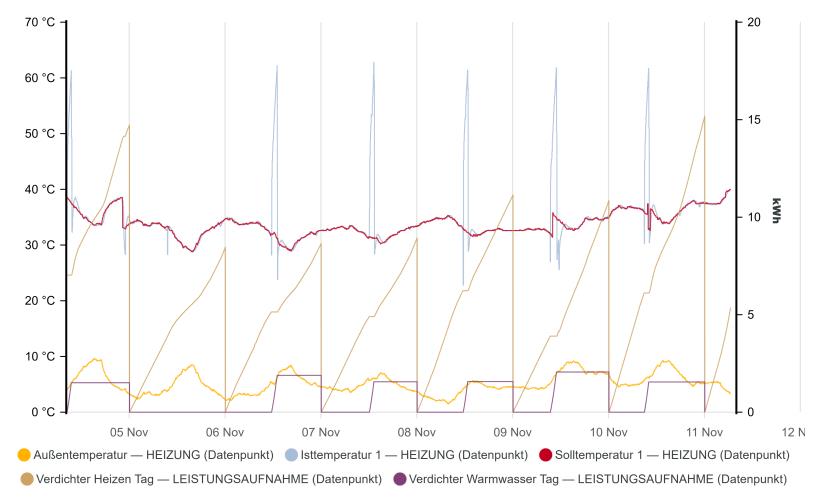 Ich denke das mit den Pumpen passt so. Da du keinen Puffer hast, ist eben die Pufferpump deine Heizkreispumpe. Namen kannst der viele geben. Mir sieht das jetz wenn die Fatenpunkte stimmen nach normalem verhalten aus. Lediglich am 5. November fehlt die Verdichterkurve. Ich muss gestehen die Ansicht sieht etwas seltsam aus zu den grünen Strichen unten für WW WW [Warmwasser] Ladung. Evtl sieht ma es besser wenn mann den Zeitpunkt wo es passiert ist sieht und einen normalen Tag, etwa mit gleicher AT AT [Außentemperatur] |