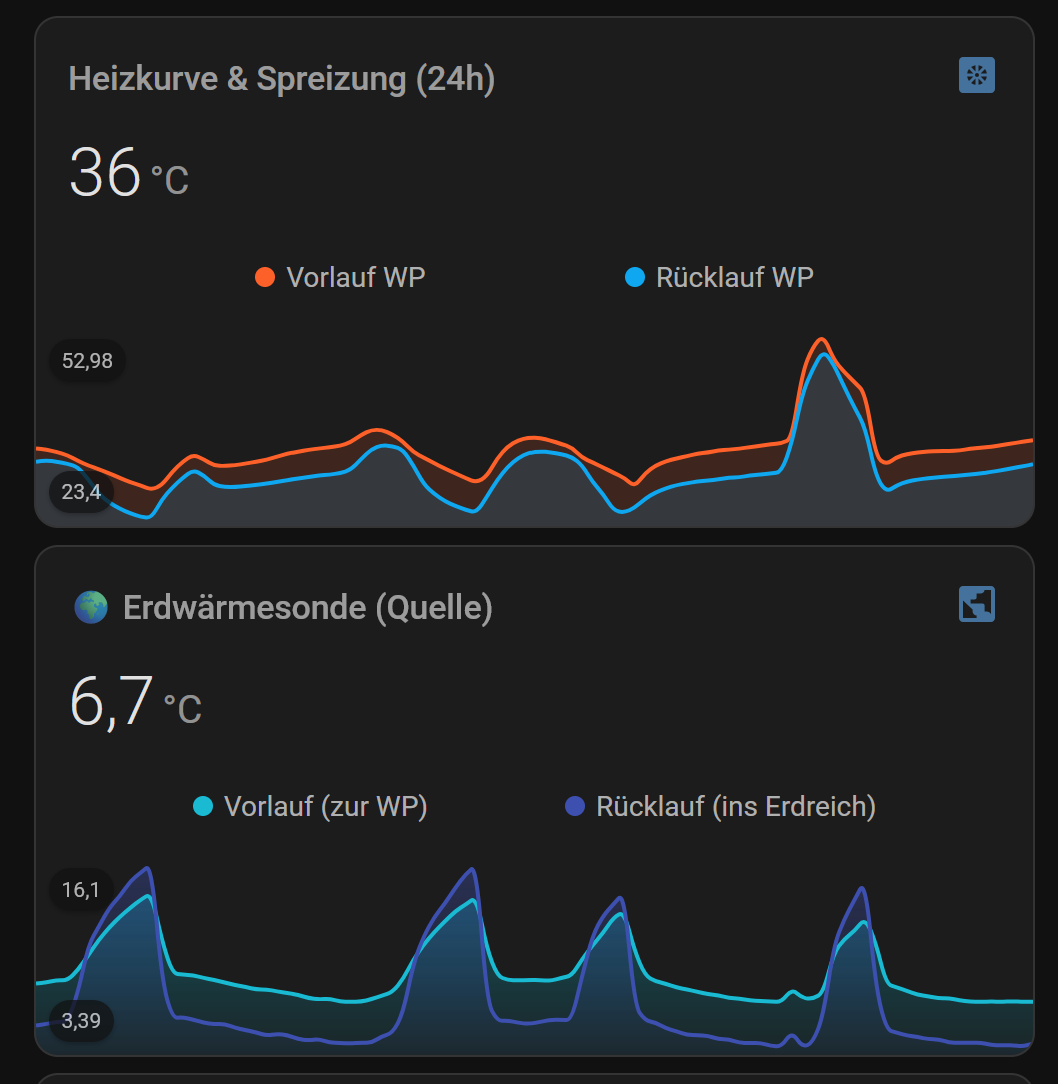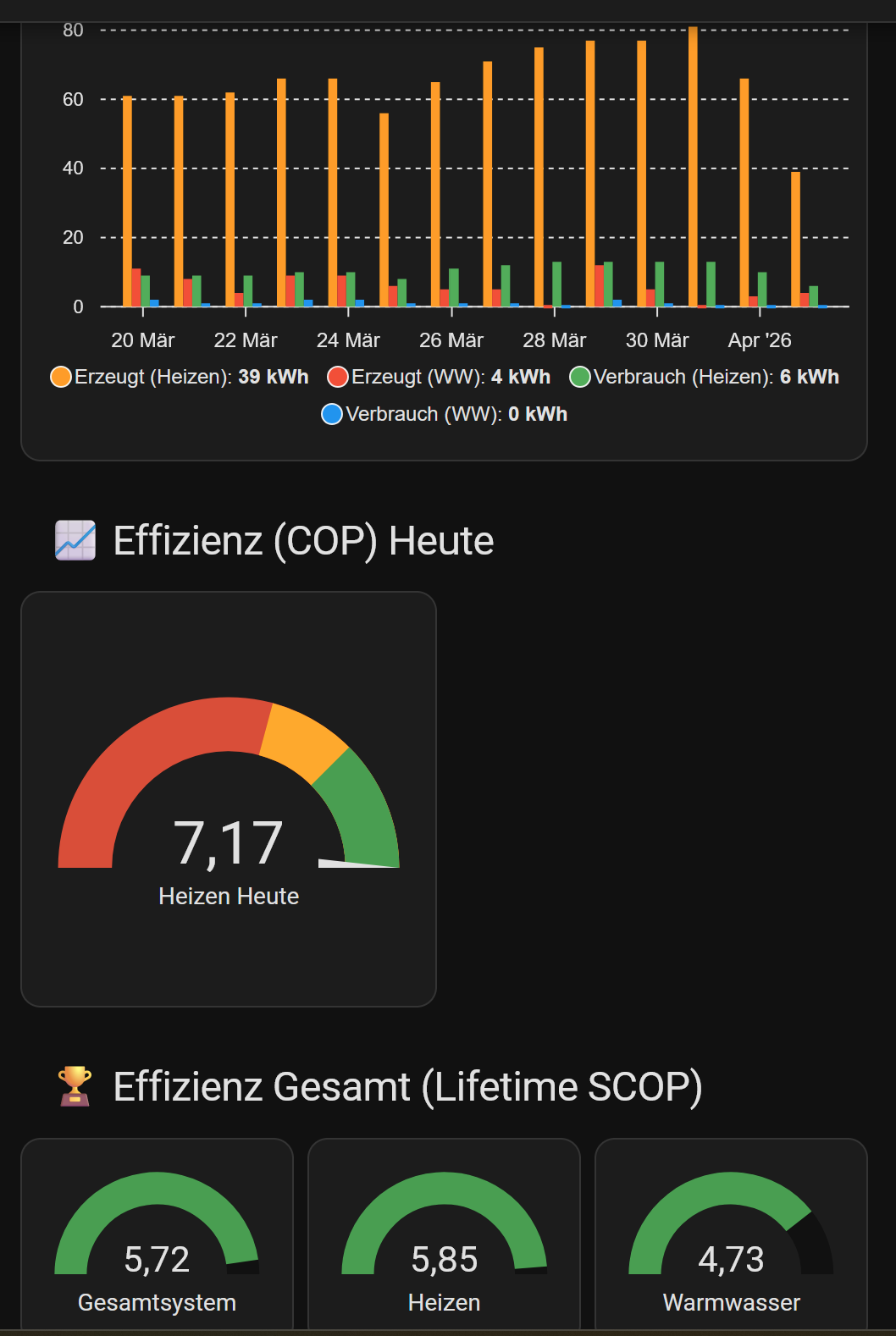 Nachdem die Frage immer wieder mal kam: mit Home Assistant kann man phantastische Dinge anstellen, teils per Modbus, teils mit Scraping. Hier mein Heizungs-Dashboard als Inspiration :) Neben der Visualisierung kann man mittels SG Ready auch die Warmwasser Produktion gut steuern, Königsweg ist jetzt, auch SNAP bestens auszunutzen, wenn die Sonne mal nicht scheint. Man kann in jedem Fall beliebig viel Zeit in das Thema stecken und mit der KI diskutieren, was sinnvoll ist und was nicht. Gerne im Detail Fragen stellen. Das um und auf ist, dass man die Sensoren erstellt oder nutzt. |