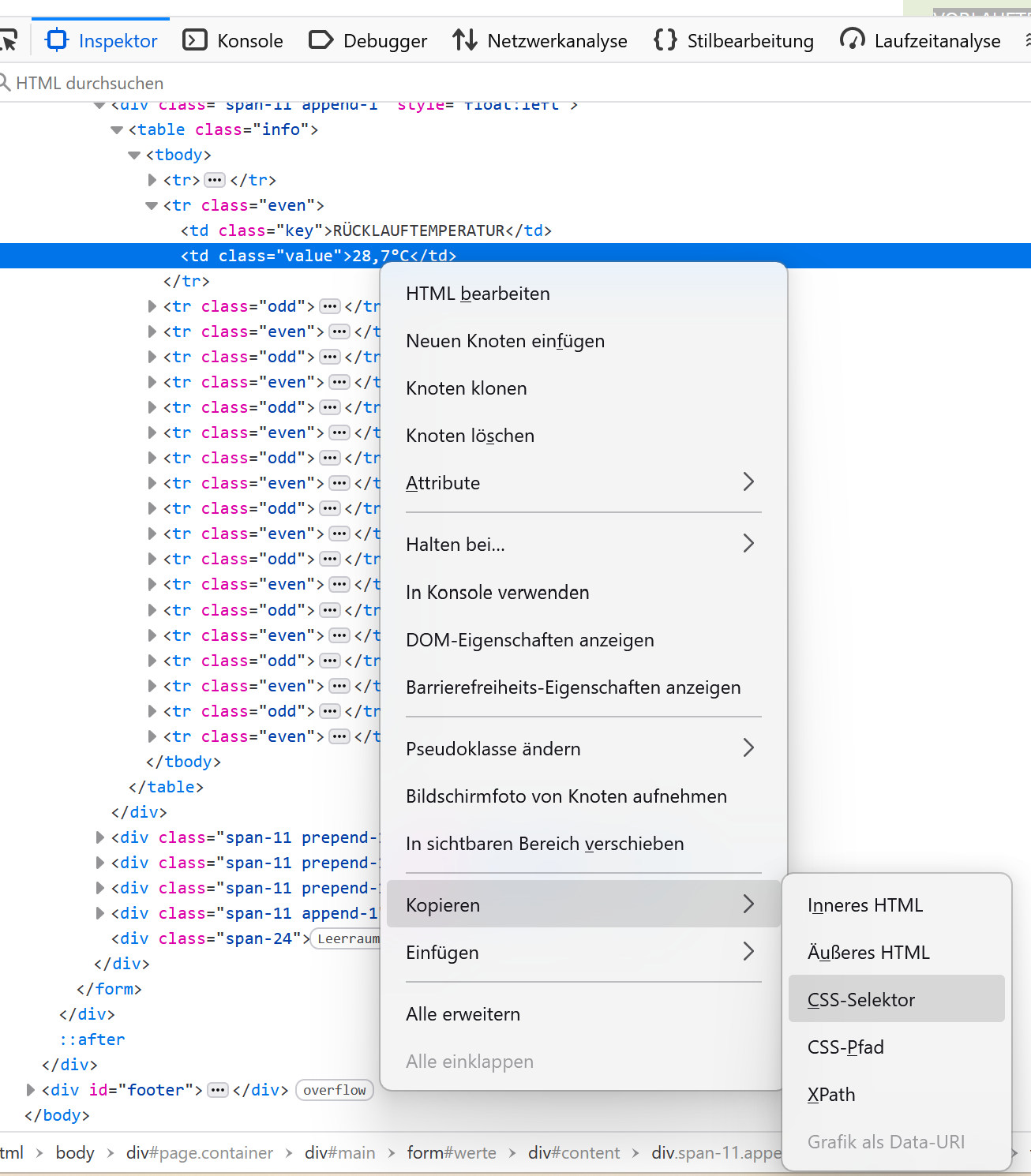 Also hier nun die versprochene Anleitung. Ziel: Auslesen von nicht direkt über die Integration ausgelesenen Werten von ISG in Home Assistant. Beispiel hier: Vor- und Rücklauftemps der WP WP [Wärmepumpe] und Verdichterstarts Was braucht es: die Integration Multiscrape: https://github.com/danieldotnl/ha-multiscrape Vorgehen: 1. Installieren der Integration mittels HACS 2. Anpassen der Konfiguration. Da ich ein Freund von aufgeräumten yaml Dateien bin, füge ich in configuration.yaml eine Zeile hinzu: multiscrape: !include multiscrape.yaml3. Anpassen von mutliscrape: ich lege eine Datei namens multiscrape.yaml an # scraping stiebel data Wie funktioniert das jetzt: zunächst kommt der Select Befehl, also wo auf der Seite soll der Scraper suchen. Dazu behilft man sich den Developer Tools eines modernen Browser, z.B. bei Firefox / Chrome markiert man den Bereich der Temperatur und klickt mit der linken Maustaste und wählt "untersuchen" - dann öffnet sich ein Bereich. In diesem klickt man auf den gewünschten Tag, linke Maustaste -> Kopieren -> CSS Selektor (die heißen in jedem Browser ein wenig anders) Ich habe die Werte zum Debuggen absichtlich als raw bezeichnet, weil ich erst mal sehen wollte, was da zurück kommt. Ich habe nur die Einheiten abgeschnitten. 4. erstellen der eigentlichen Sensoren: für die Temperaturen habe ich dann templates erstellt, in einer eigenen templates.yaml (auch wieder in configuration.yaml angegeben): - unique_id: "Stiebel Rücklauf Quelle" Damit lese ich zum Beispiel auch die genauen von der WP WP [Wärmepumpe] / ISG angegebenen Energiewerte aus. Somit bekomme ich eine sehr viel genauere Granularität hin. Ich hoffe, es war einigemaßen verständlich. Das Scrapen kann ganz schön mühsam sein, aber wenn es mal läuft, hat man eben alle Werte, die potentiell auf der Oberfläche angeboten werden.