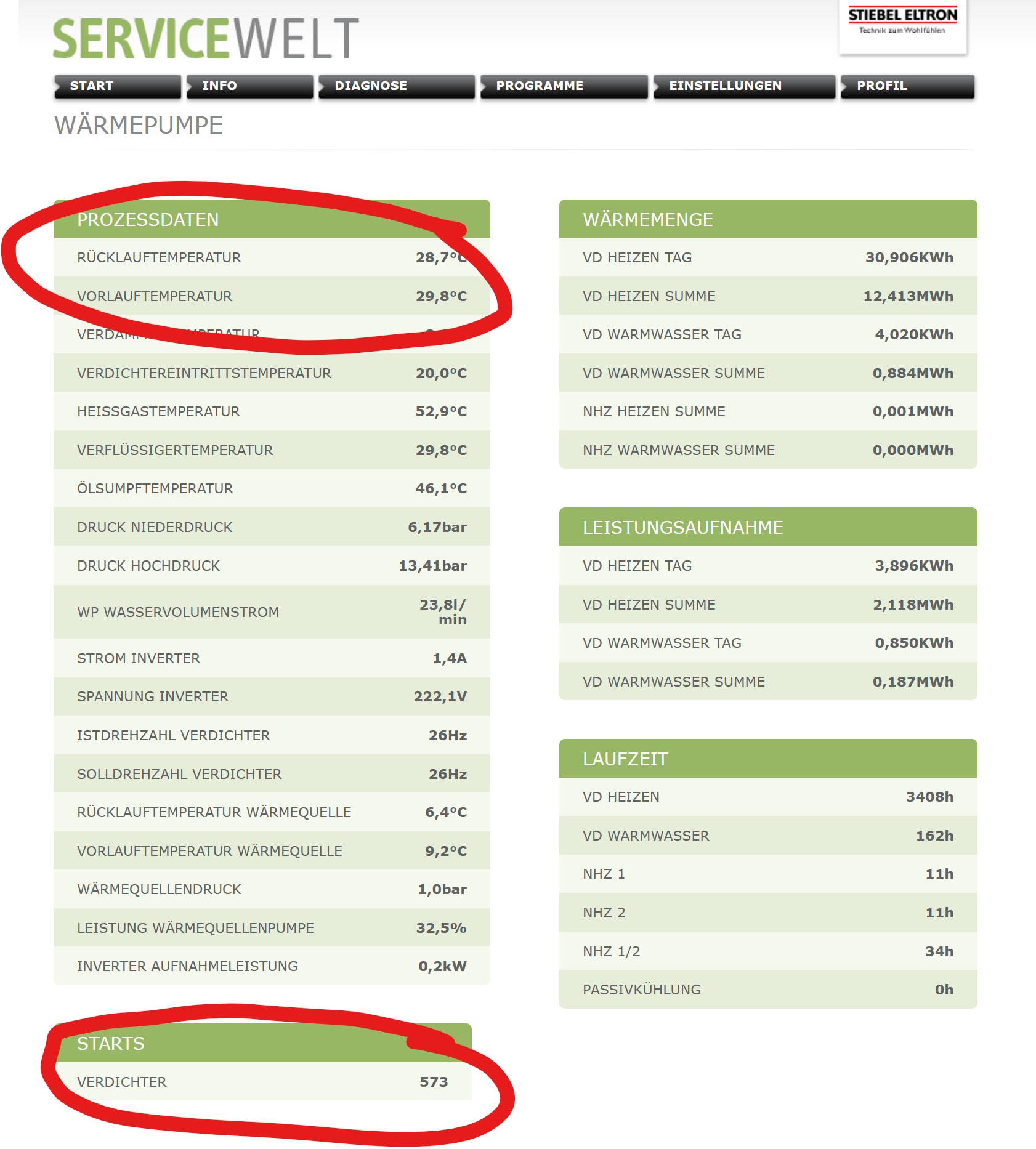Die WPE-I 0x können nicht aktiv kühlen, sie kühlen passiv. Vielleicht ist der Eintrag im HA ja für WP WP [Wärmepumpe], die aktiv kühlen. Ich habe keinen Home Assistant, aber die Werte aus der Servicewelt sollten vergleichbar sein. Um zu sehen, ob die Kühung funktioniert, ist es sicher am einfachsten, die Vor- und Rücklauftemperaturen zu kontrollieren: Beim Kühlen sollte die Rücklauftemperatur im Heizkreis höher sein als die Vorlauftemperatur, bei der Wärmequelle genau anders herum. Meine Werte in der Servicewelt (Info - Anlage http://servicewelt/?s=1,0) sind folgende: |
