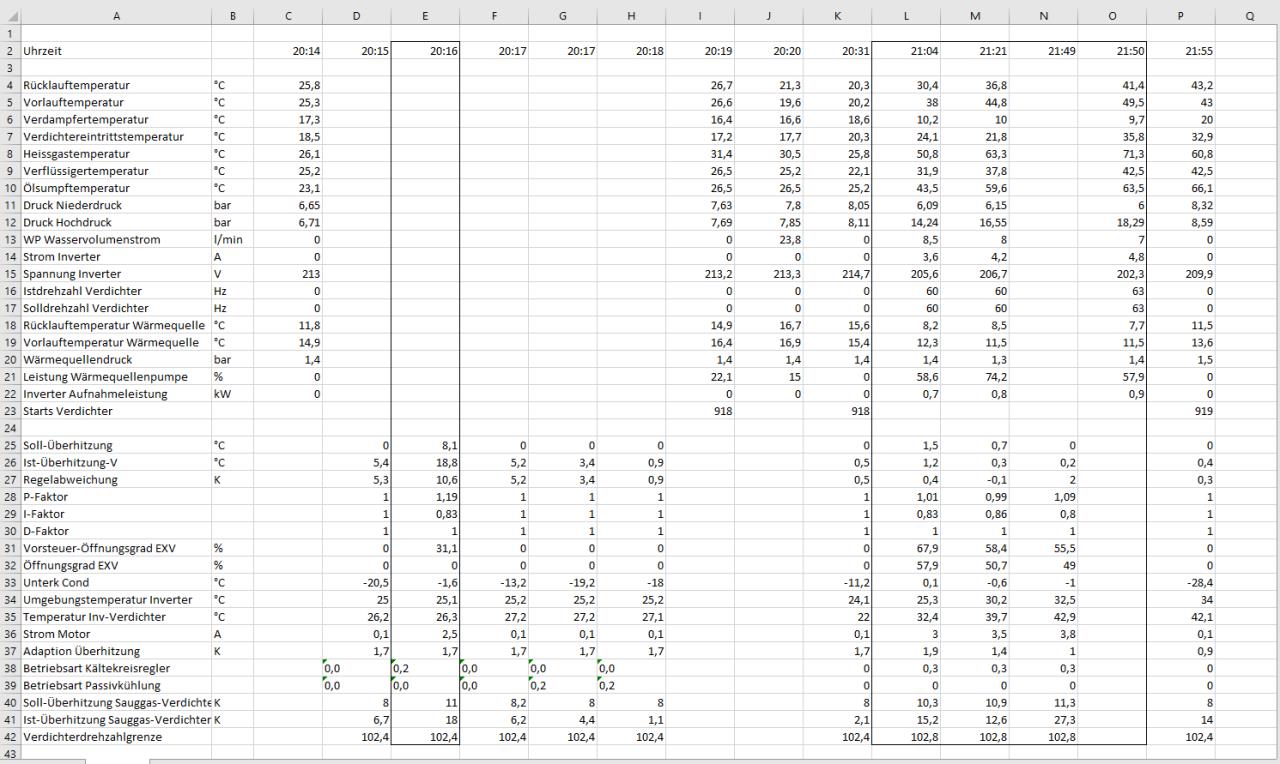 Kennt sich von euch jemand mit der Kühlungsfunktion der WPE-I 0x HK gut genug aus, um mir auf der Fehlersuche zu helfen? Ich habe gerade die nachträgliche Aktivierung meiner Kühlfunktion über die FBH FBH [Fußbodenheizung] in einem eigenen Thread gepostet, damit es hier nicht zu weit offtopic geht. https://www.energiesparhaus.at/forum-nachtraegliche-aktivierung-der-kuehlfunktion-bei-se-wpe-i-0x-hk/83195 Meinen Fehlercode könnten aber auch andere irgendwann einmal bekommen, deshalb geht es jetzt hier im Sammelthread weiter: Ich habe - wie immer pünktlich zu Beginn einer längeren Pause des kostenlosen Service - am Mittwochabend eine Fehlermeldung bekommen, dass meine WPE-I 08 HKW abgeschaltet wurde. Laut Meldungsliste https://assets.stiebel-eltron.com/celum/Docs/originalFile/DOC-00081866.pdf ist das ein Code, der auf wiederholten Druckabfall im Niederdrucksystem hinweist: Der Servicetechniker, den ich nach dem Feiertag am Freitagmorgen am Telefon hatte, fand als Ursache eine zu niedrige Rücklauftemperatur der Wärmequelle (Tiefenbohrung), vermutlich verursacht durch einen Fehler/Stillstand der Wärmequellenpumpe. Nach Überprüfung des Drucks im Solekreislauf, Pumpentest und Reset war der Fehler weg, ich sollte mich noch einmal melden, wenn er nochmals auftreten würde. Das war ca. 1,5 Stunden später der Fall - ich habe angerufen, die Telefon-Fachkraft hat mir versichert, dass mein Ticket noch offen wäre und ich vom Techniker noch einmal angerufen würde. Mein Fehler war, dass ich darauf nochmals knapp 2 Stunden gewartet habe (bzw. geschlafen nach dem Nachtdienst), so dass es 12:10 Uhr war, als ich erneut anrief. Dass die kostenlose Servicenummer am Freitag um 12 Uhr abgeschaltet wird, ist mir erst dann aufgefallen... Ich habe dann die Service-Hotline in Deutschland (Nummer steht auch in Österreich auf jeder Seite unten in der Servicewelt) angerufen und mein Problem erklärt. Als die Dame dort erfuhr, dass ich keine Techniker vor Ort, sondern nur telefonische Unterstützung brauche, sicherte sie mir zu, dass sich ein Techniker aus Deutschland höchstwahrscheinlich noch am gleichen Tag bei mir melden würde. Jetzt ist Samstag Nachmittag - einen Anruf habe ich bisher noch nicht und rechne damit auch nicht vor Montag. Was ich gestern - wegen zunehmend kühler Warmwasser-Temperatur (26°) - gemacht habe, ist folgendes: 1. erneuter Relaistest der Wärmequellenpumpe 2. nochmaliges Reset Abwarten des Wiederanlaufs und Beginn der Dokumentation über Screenshots in der Servicewelt 3. Kühlungsfunktion ausgeschaltet (vor 4 Wochen aktiviert, vorher keine Fehler - vielleicht jetzt draußen zu heiß?) Fehlermeldung kommt erneut (kann auch schon einige Minuten vorher aufgetreten sein - in der Servicewelt nur in der Meldungsliste sichtbar) 4. erneutes Reset bei Pumpe im Bereitschaftsmodus 5. Pumpe für 5 Min. stromlos gemacht und neu gestartet => Jetzt läuft die Pumpe und macht wieder heißes Wasser Ich traue mich jetzt aber nicht, die Kühlung zuzuschalten, bevor ich nicht ein paar Fragen gelöst habe. Da ist es mir lieber, das Haus wird langsam wärmer, als dass wir wieder ohne warmes Wasser da stehen. Meine Fragen: 1. Die Schiebeschalter (BA) am WPM sollen laut Bedienungsanleitung bei Position 1 und 4 oben, bei Position 2 und 3 unten stehen. Bei mir an der WP WP [Wärmepumpe] ist nur Position 1 oben (habe ich schon im anderen Thread mit Bild gepostet), hier passt es vielleicht besser hin. Weiß jemand, was die 4 Schalter bedeuten/bewirken? Wenn die Einstellung bei mir (wie ich vermute) darauf beruht, dass die Kühlung ursprünglich nicht aktiviert war, könnte dies zu Folgefehlern durch die Software führen? 2. Ich habe gestern abend immer wieder Screenshots von den Daten in der Servicewelt gemacht - sowohl von der Seite 1,1 (Info - Wärmepumpe) als auch von der Seite 2,4 (Diagnose - Analyse Wärmepumpe), ob ich tatsächlich relevante Daten zur Fehler-Eingrenzung aufgezeichnet habe, weiß ich leider nicht. Ich habe alle Daten aus den Screenshots in eine Tabelle eingegeben, damit man die Verläufe besser beurteilen kann: Falls ich die EXCEL-Tabelle irgendwo hochladen oder sie hier in Tabellenform einfügen sollte, bitte um Information. Auffällig sind für mich: Die Uhrzeit 20:16 (leider zu dem Zeitpunkt keine Info-Daten, sondern nur die Analyse) mit einer kurzfristigen Überhitzung, einem erhöhten Vorsteuer-Öffnungsgrad EXV von 31% bei 0% Öffnungsgrad EXV. Wie kommt so etwas zustande? Zeigt der Screenshot genau den Moment, in dem die Anlage anfängt zu arbeiten (Motor 2,5A), aber sofort wieder abbricht? Irgendwann zwischen 20:31 und 21:04 hat die WP WP [Wärmepumpe] begonnen, zu arbeiten, um das Brauchwasser aufzuwärmen. Dies ging bis 21:50. Um 21:55 ist die Pumpe aus (Strom 0 A, Verdichter 0 Hz), die Wärmequelle wird wieder wärmer, Hoch- und Niederdruck passen sich an. Kann man irgendwo an den Daten ablesen, ob das ein normales Ausschalten oder ein Abbruch wegen eines Fehlers ist? Etwa 5 Minuten später habe ich den Fehler gesehen - und wenn ich die Meldungsliste richtig im Kopf habe, war der Fehlerzeitpunkt tatsächlich bei 21:55 (bin leider nicht vor Ort, sonst könnte ich nachsehen). Rein interessehalber: Entspricht die Wärmequellenpumpen-Leistung von 22% um 20:19 ohne Verdichteraktion (0 Hz) der Passivkühlung (Betriebsart 0,2)? Was macht dann die Betriebsart Kältekreisregler 0,2 um 20:16 und 0,3 beim aktiven Heizen? Wird da die FBH FBH [Fußbodenheizung] ausgeschaltet, damit das Aufheizen des Wassers die Räume nicht mitheizt? Wenn es etwas gibt, das ich morgen (dann bin ich wieder zuhause) tun kann, um die Fehlerursache einzugrenzen, mache ich das gerne - möglicherweise läuft die WP WP [Wärmepumpe] aber jetzt wieder 4 Wochen ohne erkennbaren Fehler. Falls das einen Einfluss haben könnte: Etwa 10 Meter der Zuleitung der Tiefenbohrung zum Haus liegt derzeit nur ca. 50 cm unterirdisch, weil wir darüber Pflaster legen. Eine Beschädigung ist meines Erachtens ausgeschlossen 