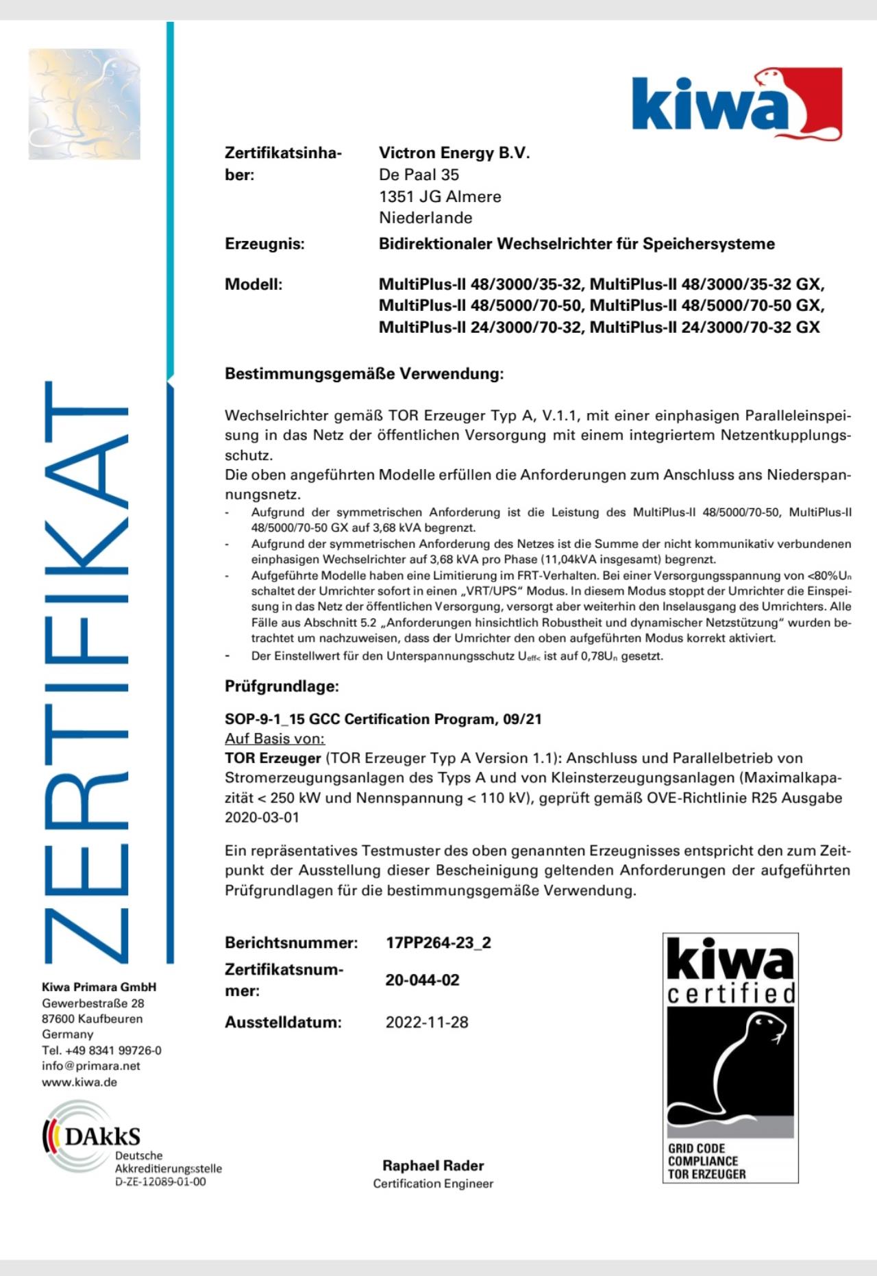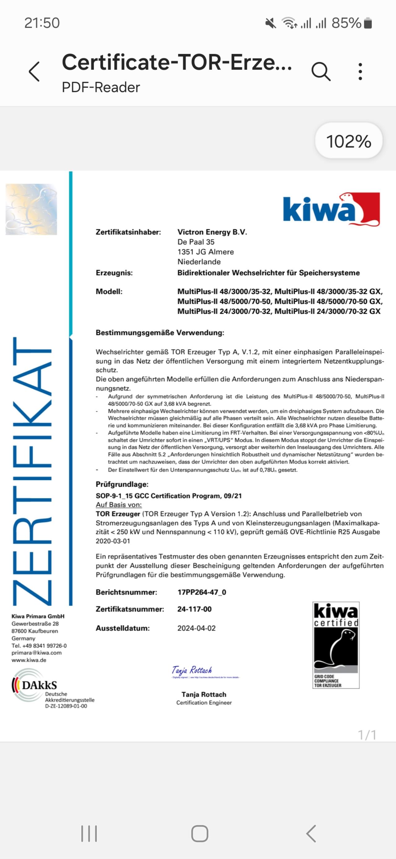 Ich bin kein Jurist, ich hab mich dann letztendlich auf meinen Victron Händler, welcher das auch häufig in AT AT [Außentemperatur] in Betrieb nimmt verlassen. Von ihm hab ich die 100% zumindest schriftlich erhalten. What shalls... |
