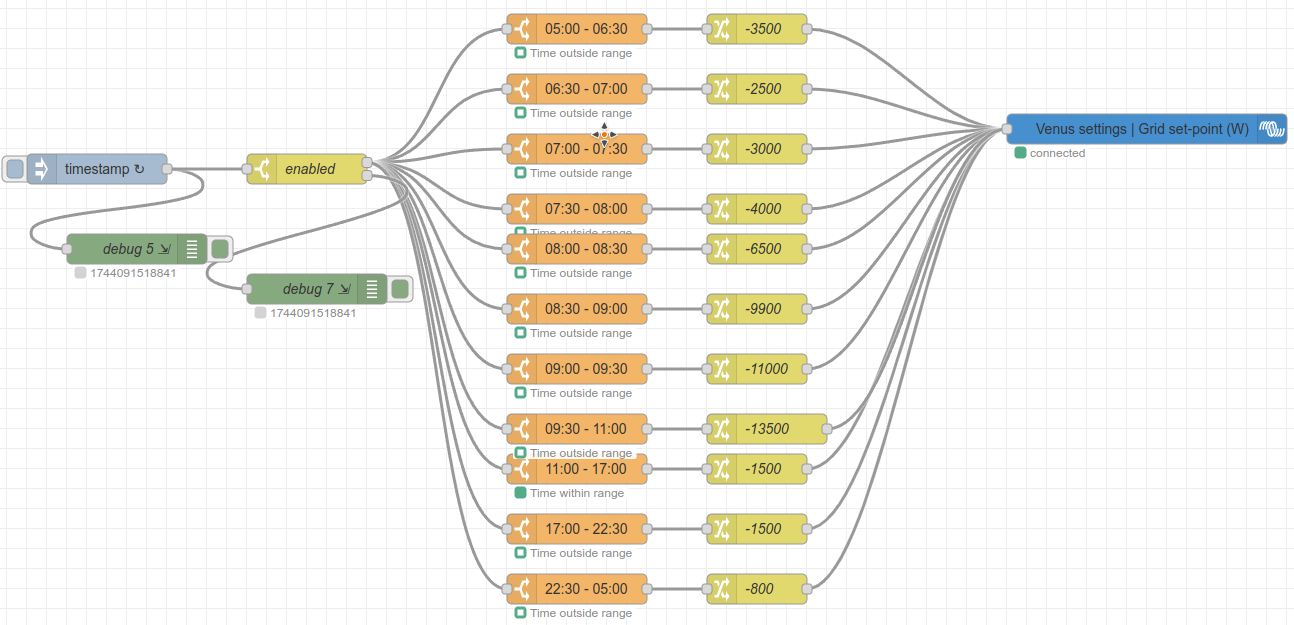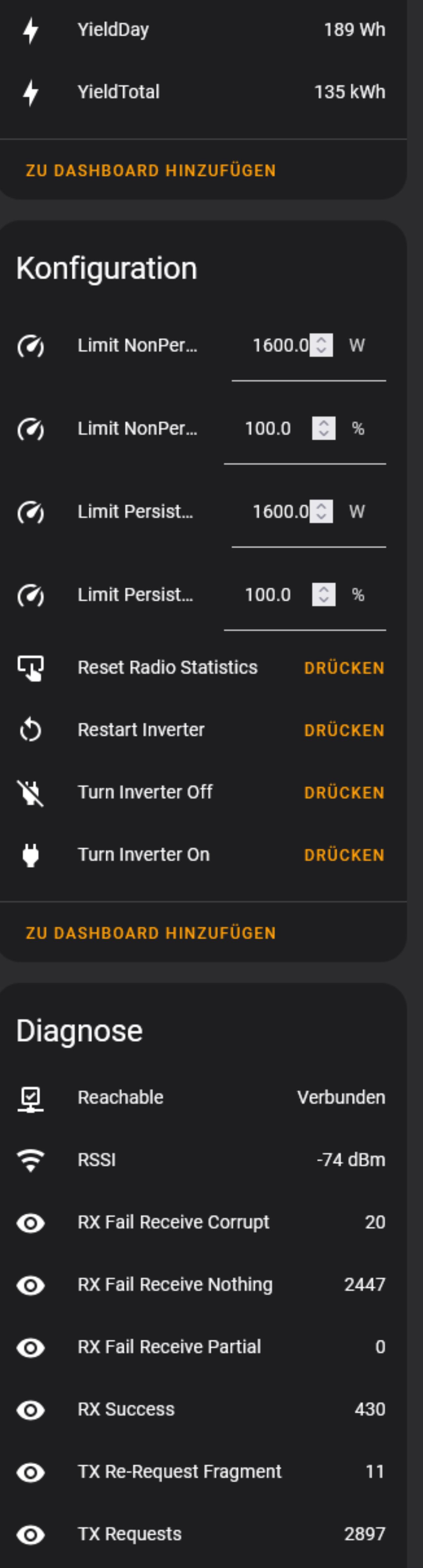 Ich weiß, das wird dir jetzt nicht weiterhelfen, aber meine gewachsene Anlage hat inzwischen 6 einzelne Wechselrichter, 4 davon sind Mikrowechselrichter von Hoymiles. Nur mit Victron wars mir nicht möglich, die Hoymiles zu bedienen, also nutze ich im Bedarfsfall Home Assistant. Im Screenshot siehst du, dass du einen Hoymiles HMT 1600 beispielsweise gut regeln/abdrehen kannst. Automatisierung dafür ist flott erstellt, Datenpunkte gibts ja genug über openDTU - MQTT. Bei mir gehts zB um ein 20kVA Limit, sollte ich da was erreichen, werden Hoymiles retourgefahren - wurde getestet - funktioniert. Ganz ohne Schütz, und Home Assistant war sowieso vorhanden. |