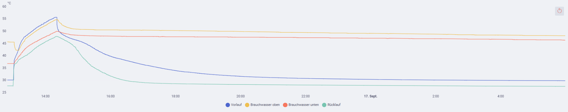 So siehts bei mir aus: 15:00 Brauchwasser oben - 50,9°C Brauchwasser unten - 48,4°C 06:00 Brauchwasser oben - 48,2°C Brauchwasser unten - 46,4°C Dauer 15h: Brauchwasser oben - 0,18K/h Brauchwasser unten - 0,13°K/h |