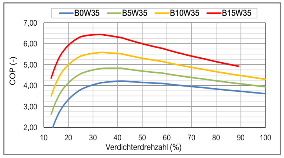 Das deckt sich mit den COP Kurven im Datenblatt. Hast du mal einen Test gemacht, wie weit die runtermoduliert? Laut Datenblatt sinds bei 20% Verdichterdrehzahl und B0W35 750W thermisch, bei B5W35 950W und bei B10W35 1,15kW. Jeweils bei 230W Stromverbrauch. Da ist der COP aber schon um 20% geringer als bei 30% Verdichterdrehzahl. |