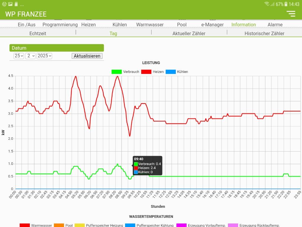 Ich habe es am Display abgelesen und da hat sie bis auf o,5 kw runter moduliert. Bei den - 10° C läuft sie dann max. auf 1,7 kw hoch. Hier mal ein Screenshot : Aktuell sind es laut Thermometer - 2 ° C Und ein Screenshot vom Januar, da sieht man den Stromverbrauch. |