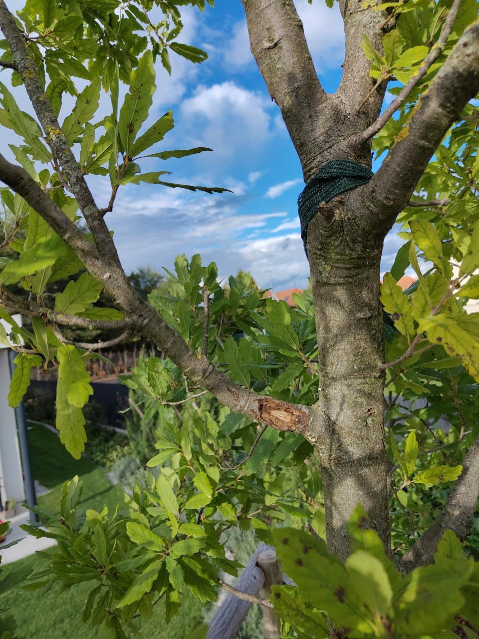 Hallo, Auf dem Foto sieht man, dass die Verletzung der Rinde nicht sehr tief ist. Das Holz ist offen, aber die Wunde ist trocken und beginnt bereits an den Rändern dicker zu werden, das bedeutet, dass der Baum versucht, die Stelle selbst zu schließen. Ich würde kein Dichtmittel verwenden und die Wunde auch nicht abdecken. Eichen heilen solche Schäden am besten, wenn die Wunde offen bleibt und gut belüftet wird. Dichtmittel und Salben halten oft Feuchtigkeit zurück, schaffen ein Umfeld für Pilze und behindern die natürliche Heilung. Wenn der Baum gesund ist, wird die Wunde nach und nach von selbst überwallen, Eichen kommen mit solchen Verletzungen gut zurecht.