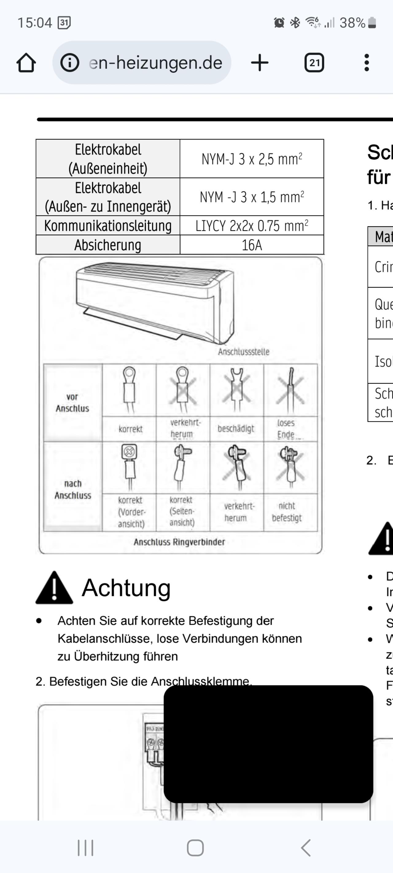 Normal haben die Kabel zur Inneneinheit mindestens 0,75mm², hier 0.5mm². Und ist das dreipolige Kabel die Versorgung von der Außeneinheit? Dann müsstest du das eh neu machen (lassen) weil mir 1.5mm² unter dimensioniert. Normal muss zur Außeneinheit auch ein H07 Kabel gehen, zumindest bei meiner Einheit ist das so vorgeschrieben... |