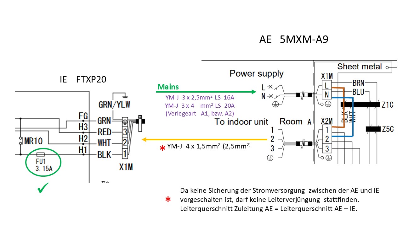 Ich kann mich nur auf die Schaltpläne beziehen, die ich im Internet für die AE und Inneneinheit gefunden habe. Und so würde ich es auch ausführen. Im Prinzip braucht es eine YM-J 4 polige Leitung. Wenn man ganz "pingelig" ist, dann darf sich der Leiterquerschnitt nicht ändern. Im Betrieb fließt ein ganz kleiner Strom zwischen IE und AE. Bei einem Kurzschluss im Innengerät fliegt die 3,15A Sicherung im Innengerät. Bei einem Kurzschluss zwischen den Anschlussklemmen im Innengerät fließen dann mindestens 3x20A (LS B20A) = 60A. Wenn die Leitung nicht übermäßig lang ist, wird es ein 1,5mm2 Leiter auch aushalten. Wichtig ist der Schleifenimpedanz von max. 2,3 Ohm, damit der geforderte Kurzschlussstrom von mind. 100A fließen kann. Diese sollte aber locker erreichbar sein. Messen würde ich diese auf jeden Fall. Aber dein Elektriker wird es schon machen - dafür sind er ja da. 😊 |