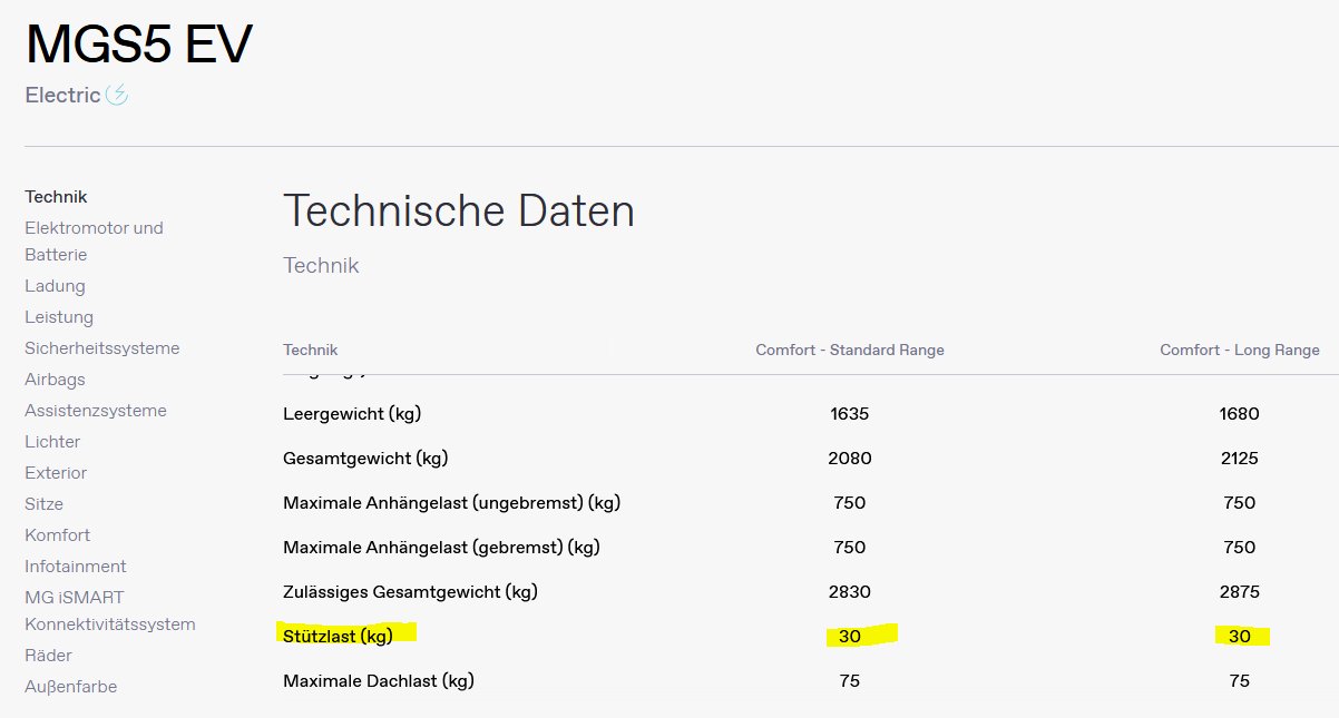 jo, beim MGS5 im detail nachgeschaut - ein hopala leider - sondergleichen keine ahnung wer sich das bei einem auto dieser kategorie ausdenkt stützlast 30kg! viel spaß mit den e-bikes und ähnlichem und die IM5 & 6 - schaun die byd seal ähnlich aus aber einen MG gibt es bei mir sicher nie mehr - nein danke |