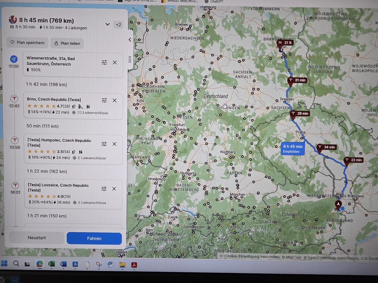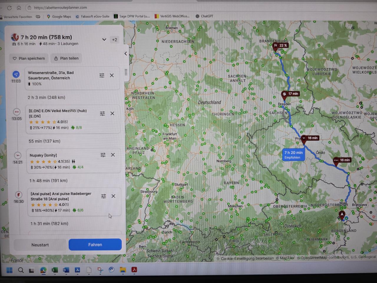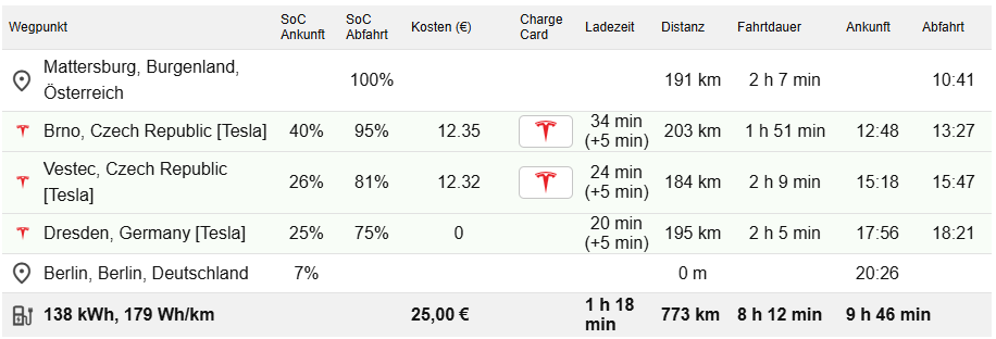 Ich habe einen SR, würde mir aber vermutlich keinen kaufen wenn ich regelmäßig nach Berlin fahren würde, aber wie man auf 1,5h Zeitvorteil kommen kann erschließt sich mir nicht. Da ich nicht genau weiß wo du wohnst, hab ich Mattersburg eingegeben, dann wären es 773km und die gesamte Ladezeit wäre unter 1,5h. ![]() |