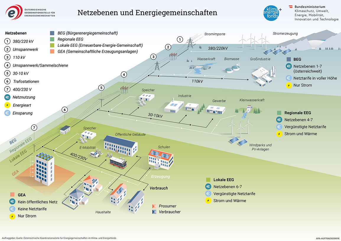BEG (österreichweit): keine Netzkostenersparnis regionale EEG (gleiches Umspannwerk): 28% Netzkostenersparnis bei NE6+7 lokale EEG (gleicher Trafo): 57% Netzkostenersparnis GEA (gleicher Anschluss): 100% Netzkostenersparnis Überischtsbild: Quelle: https://energiegemeinschaften.gv.at/erneuerbare-energie-gemeinschaften-eeg/ BEG/EEG zieht immer vor Stromlieferanten/Abnehmer Mehrfachteilnahme an bis zu 5 BEG/EEG ist theoretisch möglich (aber verrechnungstechnisch schwierig, manche Netzbetreiber schaffen es nicht mal einfache Daten zu liefern innerhalb der Fristen) |