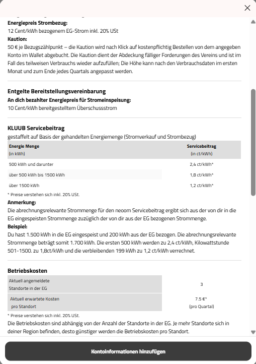 das ist leider das problem mit den privaten, dass man da gar nicht dazu kommt. leider sind hier auch nicht mehr abgebildet wie auf den anderen Seiten. Ich habe von neoom jetzt ein Angebot für eine bei uns regionale EEG bekommen. Was sagt ihr zu den Preisen bzw. der Berechnung? Sind Betriebskosten ein Standard bei EEG? Die Frage ist, ob es sich hier überhaupt rentiert wenn man dazugeht? Ich habe dzt. eine Netzeinspeisung von ca. 17 kWh und einen Netzbezug von 10kWh pro Tag. |