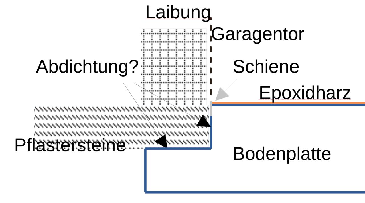 Die Einfahrt ist noch nicht gemacht. Mir ist unklar wie ich den zu beschichtenden Innenteil der Garage von der zu pflasternden Garagenlaibung trenne. Eine Schiene / L-Profil in Richtung Laibung setzen nehme ich an? Oder eine Bodenschiene kurz hinter der Laibung, auf der das Tor aufsetzt? In jedem Fall müsste ich ja schauen, dass die obere Kante/Fläche auf keinen Fall niedriger als die Gesamthöhe der aufzubringenden Schichten ist, viel höher soll sie aber auch nicht sein, da sonst eine blöde Kante entsteht. Soweit richtig?
