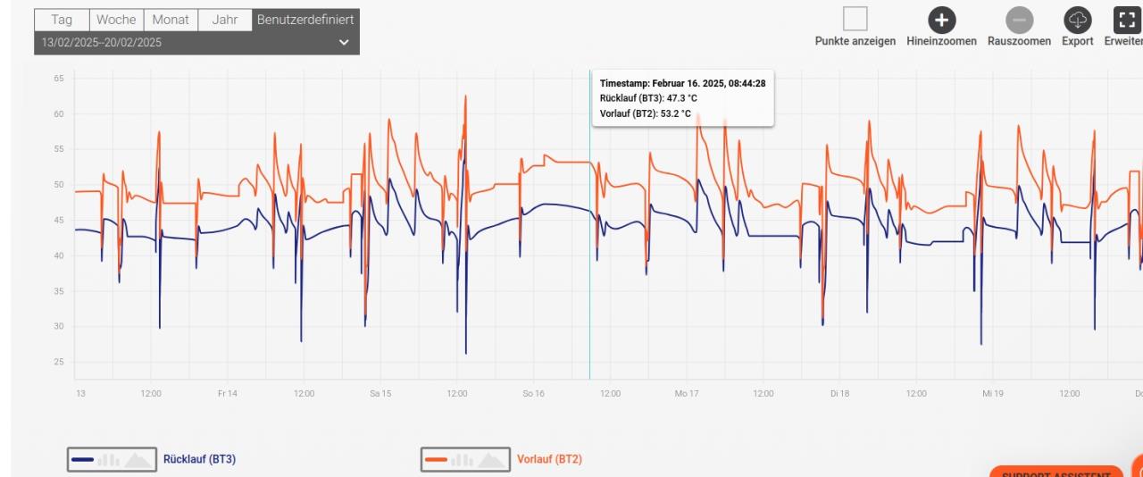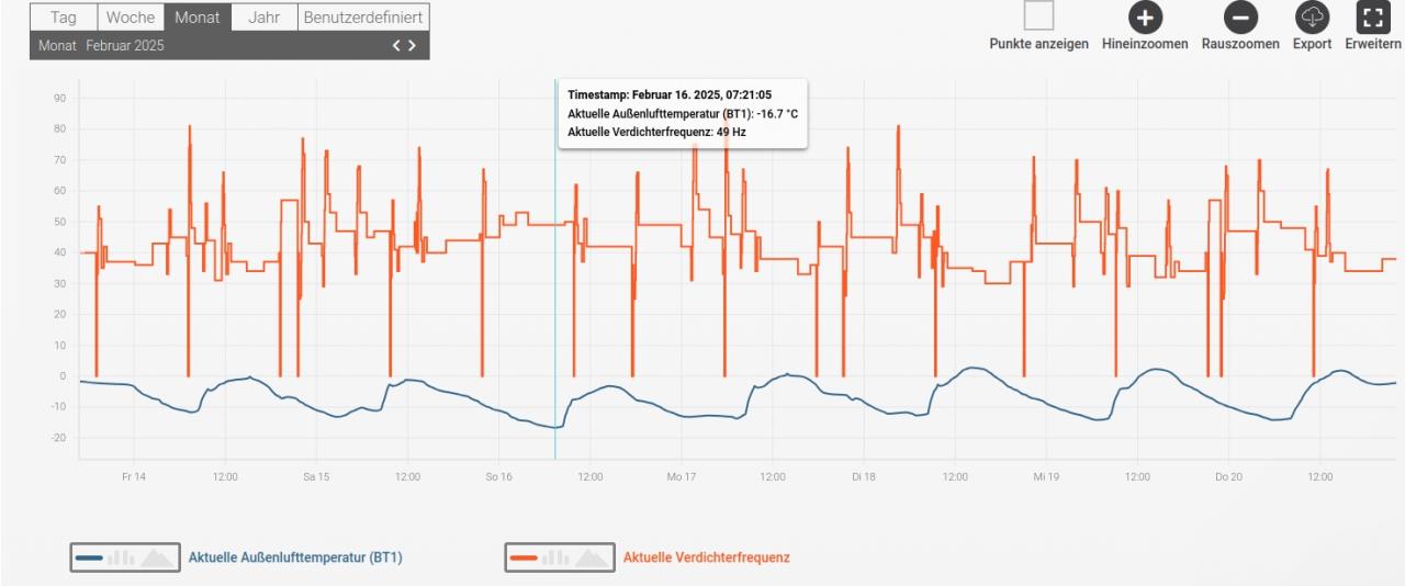 Da die Nibe 1256-8 erwähnt und vom Themenstarter eventuell mit Bauchgefühl als für zu schwach, und von den Forenprofs als zu groß angenommen werden könnte, möchte ich hier zeigen was sie zu leisten in der Lage ist - und ab wann zu viel geleistet wird. Das Fallbeispiel: Das Holzhaus von 1979 war bis Sommer 2024 mit einem 13kW Nibe Elektrokessel bestückt. Radiatoren aus Blech mit Rohrschlangen dazwischen, Nennleistung vergleichbar Typ 11. Flow30 und kluge Heizkreisgestaltung war seinerzeit nicht das Thema. Unterdimensionierung? Wie man sieht, hat diese Anlage einen absolut herausfordernden Bestand zu beliefern, der mit aktuellen Neubauten oder der Teilsanierungen des Themenstarters nur mit Anstrengung zu vergleichen ist. Hier in Smaland NAT von -18 Grad, der Februar 2024 lag für ein paar Nächte bei -20 Grad. Die letzten kältesten Nächte im Februar 2025 mit unter -16 Grad habe ich hier mal aus MyUplink rauskopiert und jeweils einen Timestamp auf den 16.Februar 2025 gesetzt. 1. Außentemperatur & Verdichter Die graphische Unruhe ist der vollautomatischen Einstellung geschuldet - inzwischen optimiert. Die 90Hz wurden bei den Aufholjagden für die Gradminuten nie überschritten, einen Einsatz der Heizpatrone gab es nicht, trotzdem damals noch keine Beschränkung bzw. Deaktivierung eingestellt war. 2. Vor- & Rücklauf VL und RL RL [Rücklauf] (die Unruhe habe ich schon kommentiert) für HK. 3. Außentemperatur, Sole ein, Sole aus 180m Tiefenbohrung in Granit, die Ethanolsole wurde niemals unter 4 Grad geliefert. Unterdimensioniert wird die 1256-8 sicher nicht sein. Die Quelle ist fett, Bude ist warm. Überdimensionierung - Takte sind doof! Weniger als 25Hz kann dieser Kompressor nicht, weshalb oberhalb von 6 Grad AT AT [Außentemperatur] die Anlage bei nur noch im Brauchwassermodus aktiv ist damit sie nicht ins Takten kommt. 1. Verdichter, Außentemperatur, Sole, Abschaltmoment Dann läuft zum Heizen der offenen Räume alternativ eine Luft/Luft-WP, die in dem Bereich frostfrei bleibt und einen tollen COP hat. Wenn ich jedoch die Heizkörper erneuern oder auf FBH FBH [Fußbodenheizung] wechseln würde, müßte der Heizbetrieb wegen der Mindestleistung schon sehr viel eher abgeschaltet werden. Und dann mit der Luftpumpe Defrosttakte zu produzieren um Takte der 8kW-WP zu umgehen, ist es sicher eine zweite detaillierte Überlegung wert, welche Mindestleistung man will und welcher Hersteller die Bandbreite anbietet. (Nebenbei, aktuell taktet die 1256 immernoch alle 12 Stunden) |