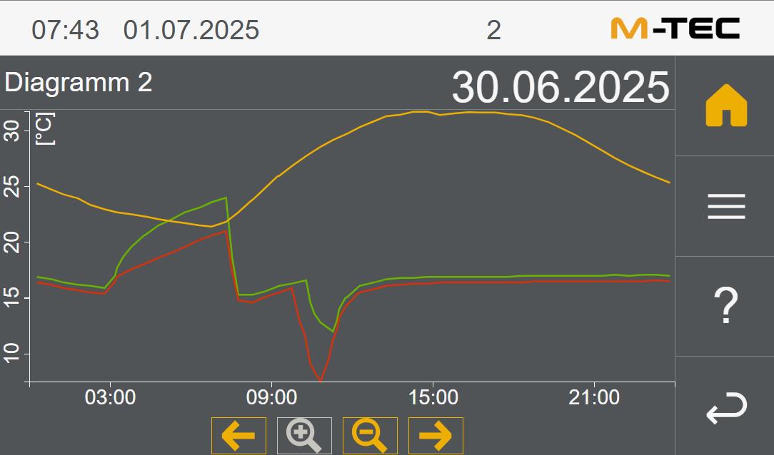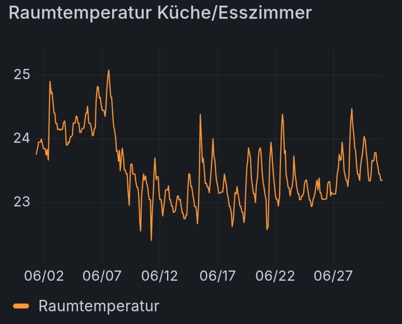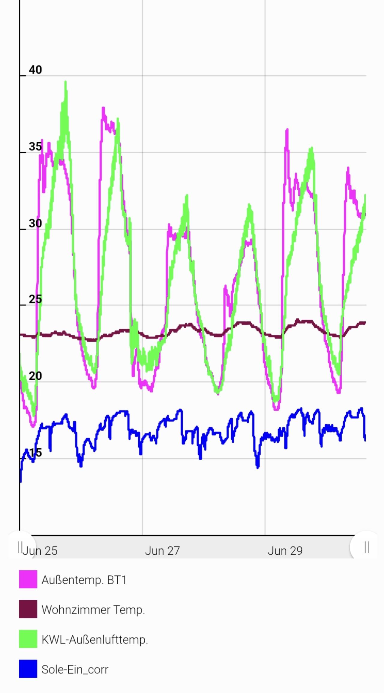 so siehts zu Hause aus. IT pendelt zw. 23-24C Sole-Ein zw. 16-18C das ist bei uns die Phase, wo ich auch aufpassen muss, nicht zu stark zu kühlen, weil sonst Nachts die Temp. zu weit runter geht im Haus. Da hab ich schon draus gelernt. Wenns da doch mal auf 22C runtergeht, sitzen sonst die Mädls in Decken eingehüllt beim Frühstück und meckern... 😉 Da lieber mal auf 24C untertags raufgehen lassen. Fühlt sich auch angenehmer und natürlicher an. (wenn die Luftfeuchte passt 😇) |