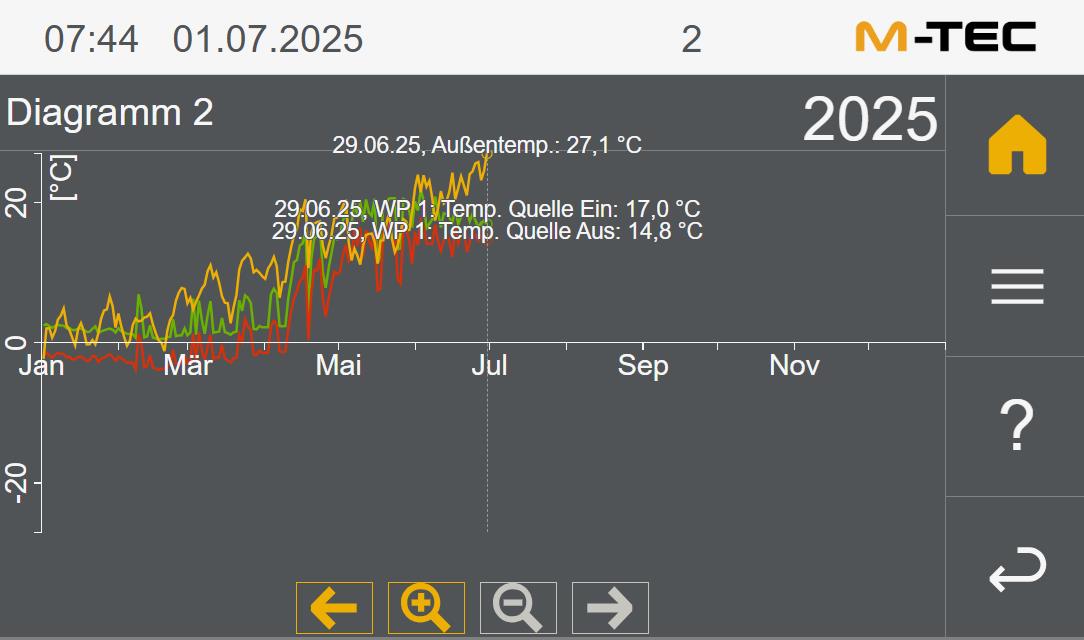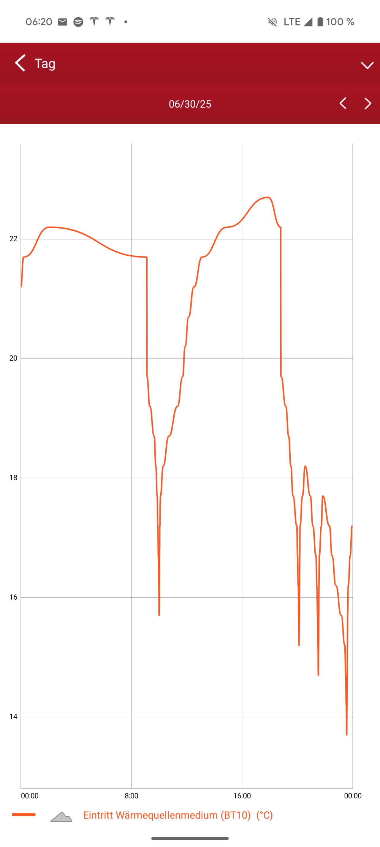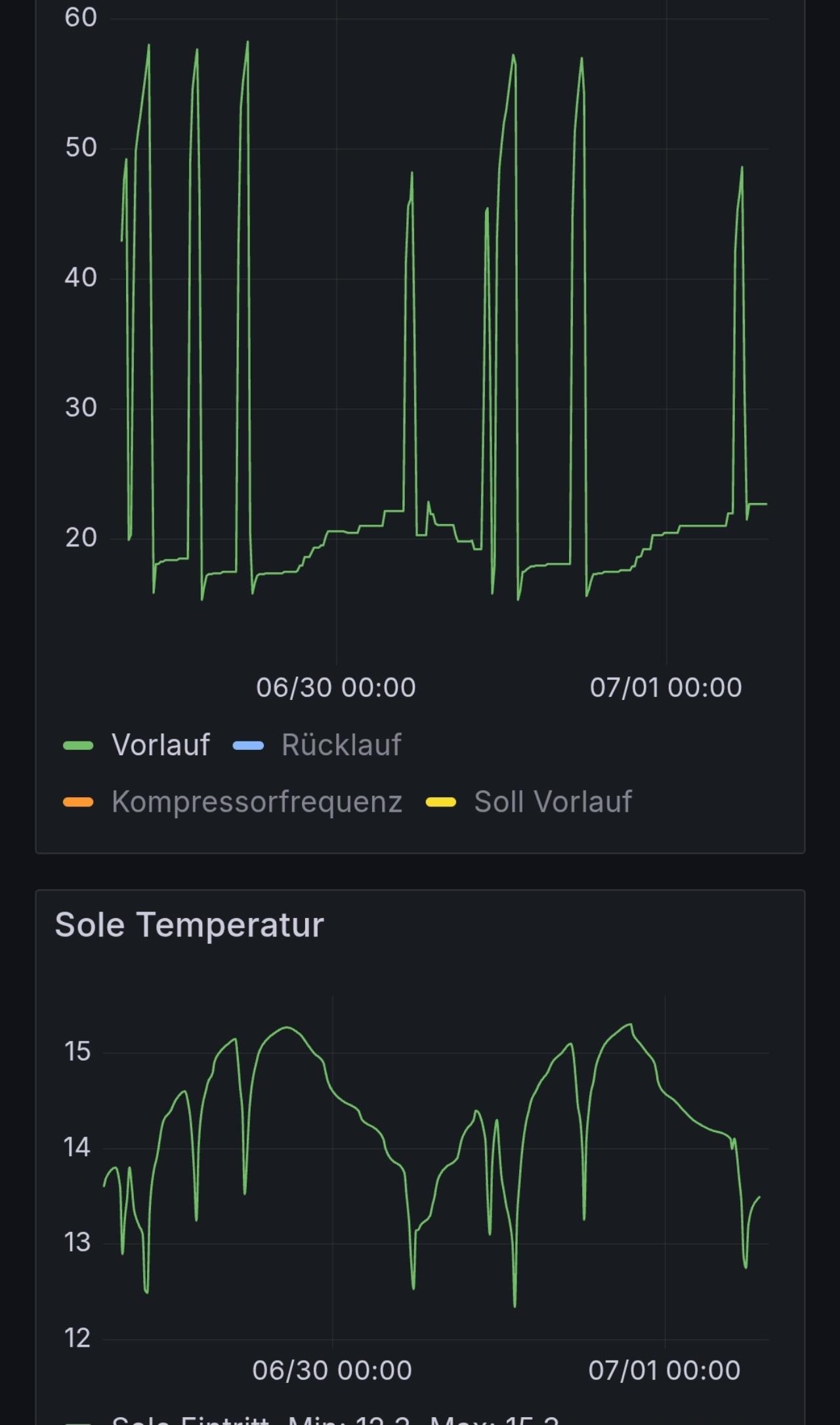 Am Ende WW WW [Warmwasser]-Bereitung: Sole-Ein: 12°C Sole-Aus: 7,5°C Unter Tag gehts dann rauf: Sole-Ein: 17,1°C Sole-Aus: 16,6°C Standort: Bezirk Amstetten, NÖ Wärmepumpe: M-Tec WPS26-V2 RGK 1x400m DA40 Baujahr 2024 Passive Kühlung läuft aktuell ab AT AT [Außentemperatur] 20°C, evtl. werde ich das noch umstellen, so dass sie bei den aktuellen Temperaturen durchläuft. Wobei ich aktuell im Haus sehr angenehme 21°C - 23°C hab (ohne Außenputz). Etwas ungleich verteilt, das will ich auch noch verbessern. Die hohen Werte vor der WW WW [Warmwasser]-Bereitung (24°C/21°C) erklär ich mir damit, dass hier die Pumpe nicht läuft, dadurch die Sole steht und sich aufwärmt. Die Werte sind zu diesem Zeitpunkt somit unbrauchbar, was sagt ihr? |