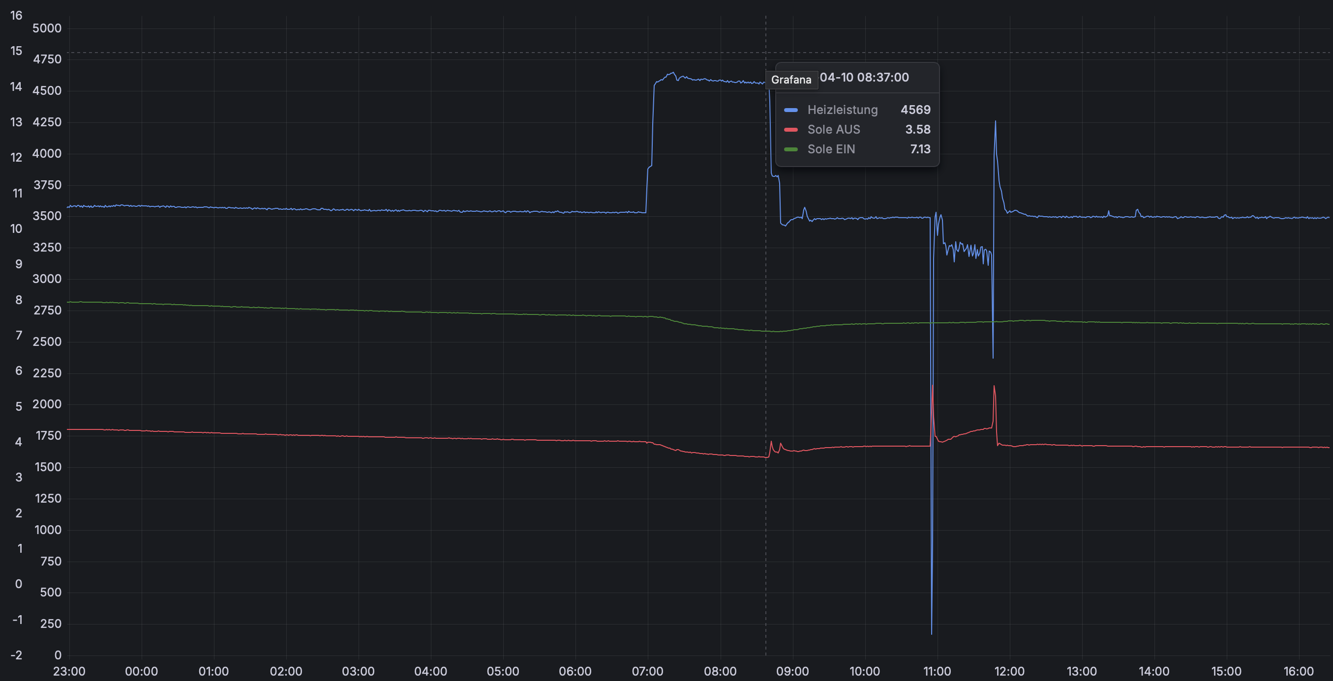 Wärmequelle: Hybrid - Tiefenbohrung 2x 100 m Simplex DN40 + 50m Spaghettikollektor als Vorerwärmung. 2-Kreiser DN40 270m. Standort: Süd/Ost-Steiermark Baujahr: 1995 (massiv 38er Ziegel + 5cm Thermoputz) Durchschnittliche AT AT [Außentemperatur]: 7°C (24h) Aktuelle AT: 6.5°C (16:00 Uhr) Stiebel Eltron WPE-I 07.1 H Plus KT-Pumpe: KT ein: 7,33°C KT aus: 3,86°C Drehzahl der WQ-Pumpe: 41% (35% - 70% limitiert) Volumenstrom Quelle: 0,684m³/h Heizkreispumpe: berchnete VL VL [Vorlauf]-Temp.: 37,6°C Vorlauftemp.: 36,9°C Rücklauftemp.: 32,2°C Raumtemp.: 23°C (Schlafzimmer laut Raumfühler) Pumpengeschw. Wärmetr.: 57% (57% - 100% limitiert) Volumenstrom: 0,648m³/h akt. thermische Leistung: 3,48 kW Verdichter: 2700 rpm (1400 rpm - 6000 rpm) jedoch Testweise nur 2700 - 6000 rpm freigegeben. GM: ? COP (Kältekreis): 5,50 Gebäude-Heizlast Abschätzung laut Energieausweis: 8,5 kW (ca. 2000l Öl pro Jahr) TB Kälteleistung (errechnet): 7,0 kW (35W/m, Ton, Mergel, Sand bei 2400h/a) Gebäude: Beheizte Fläche: 180 m² Typ22 HK + 35m2 Wandheizung im RL RL [Rücklauf] (Innenwände) Hier der Verlauf der letzten 17 Stunden. Ab 7:00 hebe ich die Soll-VL um 4°C an, um den PV Eigenstromverbrauch zu erhöhen. Letzte Woche lag die höchste Sole EIN nach 10 Stunden Taktpause bei 9,5°C. |
