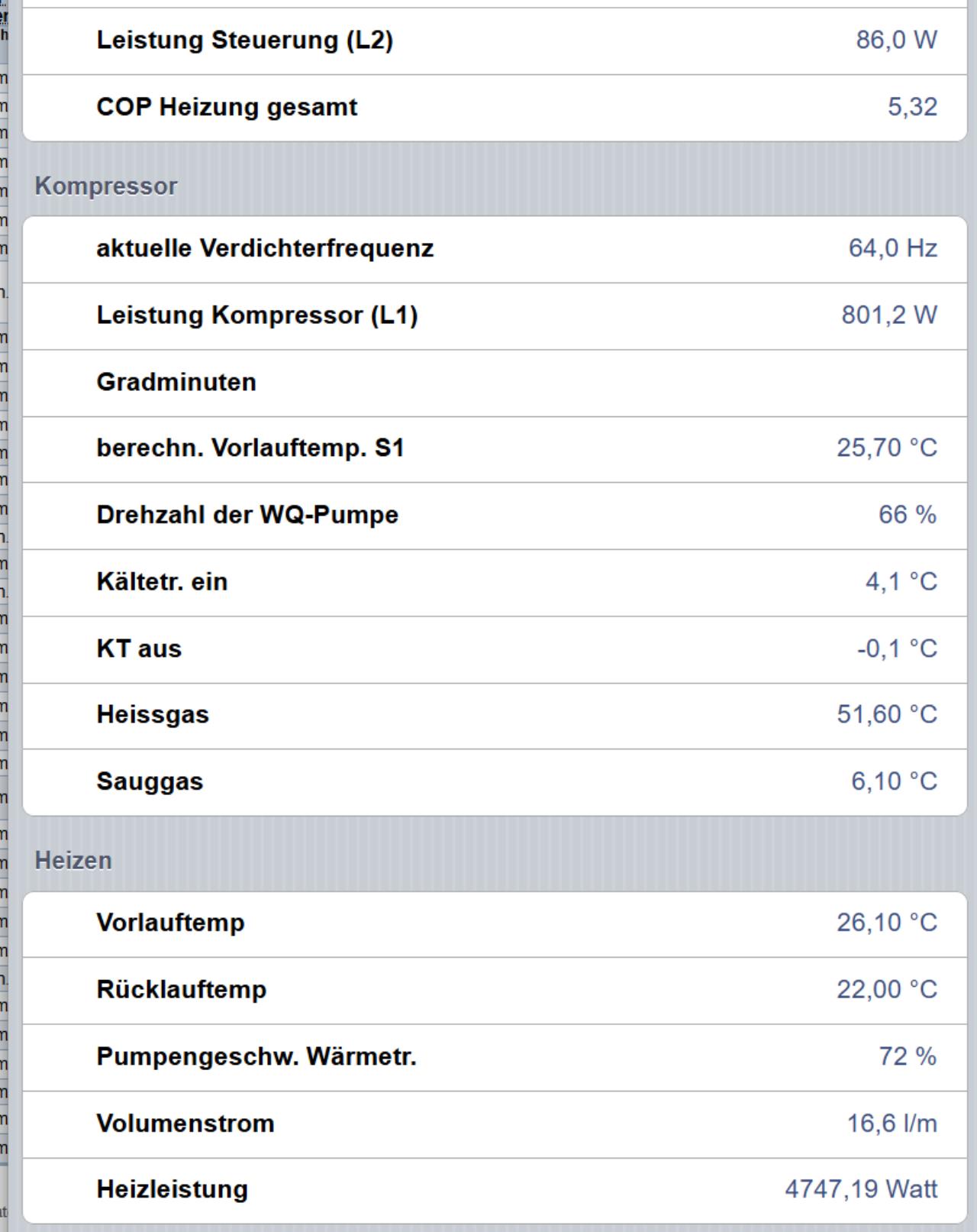 Quelle 1x TB Duplex 115m Standort NÖ Zentralraum Massivbauweise, Beton/Ziegel 25cm + 28cm WVDS Baujahr 2022 UG+EG+OG gesamt ca. 240m² beheizte Fläche, FBH auf gesamter Fläche, KWL noch nicht in Betrieb, KNV(Nibe) S-1255-6 PC KT-Pumpe: KT ein 8.2°C KT aus 4.2°C Drehzahl der WQ-Pumpe 19% Volumenstrom: 7,5l/m (Menü 3.1.10) Heizkreis/Pumpe: Drehzahl HU-Pumpe 30% (eingestelltes unteres Limit) Volumenstrom 13.5l/m (Menü 3.1.10) Heizung Kondensator Vorlauf 26.9°C Rücklauftemp. 23.9°C (Menü 3.1.3) Raumtemperatur 22.8°C (Raumthermometer Esszimmer) Verdichter: Frequenz: 25Hz (Dauerlauf seit 13.Nov. 2025, max. eingestellter Wert, Heizung und WW) Leistung 233W im Heizbetrieb, (Menü 3.1.7) |
