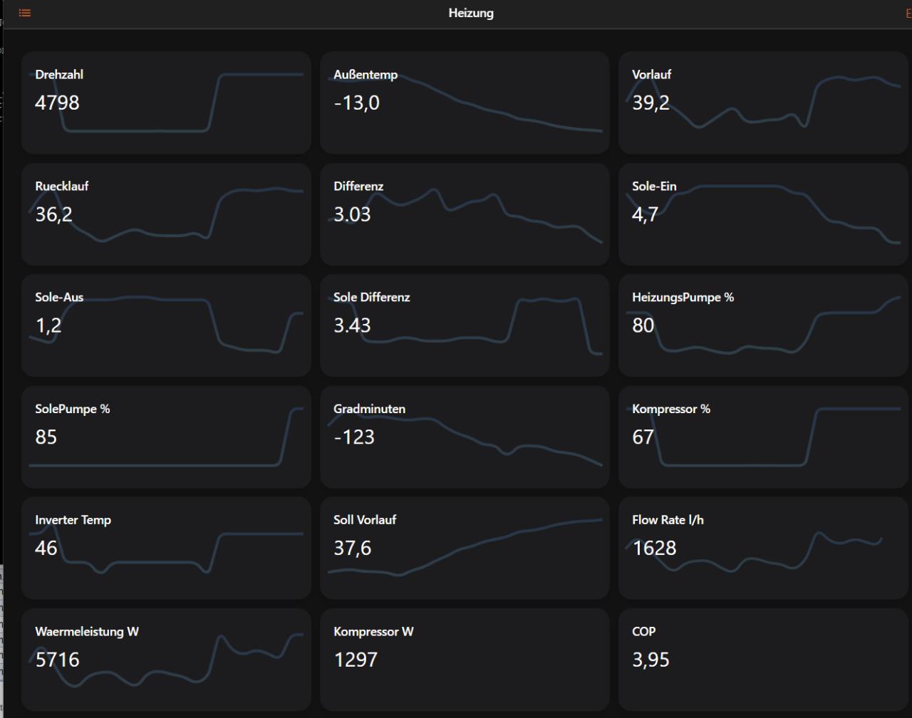 Standort: OÖ (Pyhrn–Eisenwurzen Region) Quelle: 1* TB Duplex 160m ~180m^2, leicht sanierter 70er Jahre Bau (3cm Innendämmung, Dach gedämmt, 2fach verglaste Fenster, größere Heizkörper, teilweise Lüfter nachgerüstet) elektrische Leistung im Screenshot ist nur der Kompressor, COP rechne ich auch die beiden Pumpen mit (aktuell ~120w) Stiebel Eltron WPE-I 07.1 Plus H 400 als Vergleich Standort: OÖ (Pyhrn–Eisenwurzen Region) Quelle: Flächenkollektor auf KNV 1155-06 BJ2020, 50er Ziegel Bungalow mit ~220m^2, FBH, BKA, Wandheizung |
