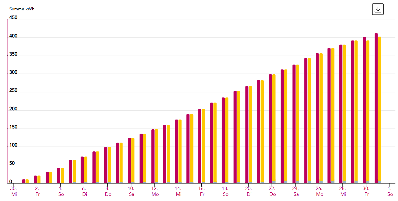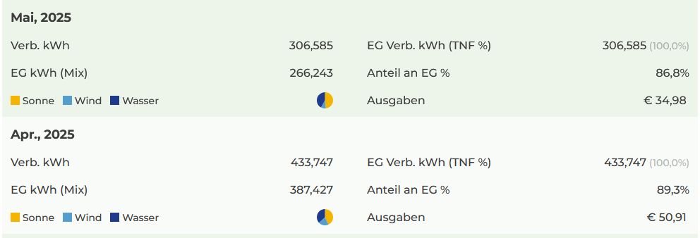 Meine Eltern brauchten im Mai 411 kWh, davon kamen 404 kWh aus unserer BEG und sie hatten 7 kWh Restbezug (98,3% Eigendeckung durch die BEG)