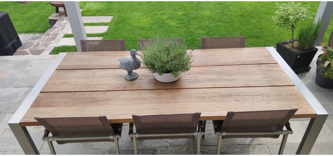 Hallo ihr Lieben, wir sind auf der Suche nach einer Terrassengarnitur und auf diese wunderschöne Garnitur gestoßen. Teak recycelt 100 Jahre alt aus dem Schiffsbau.