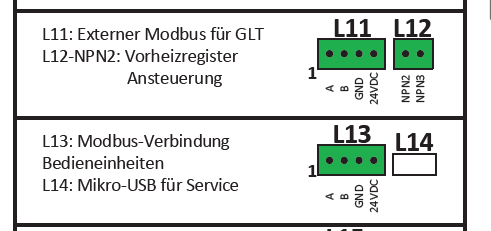 Hallo ich bräuchte Unterstützung bei der Modbus-Integration. Mittels Weinzierl 886 soll die Verbindung zu KNX hergestellt werden. Anleitung Pichler: --> externe Spannungsversorgung 12-24VDC für das Weinziel 886, wie in der Anleitung erwähnt, ist bei mir nicht notwenig, bzw. machte Probleme. https://www.pichlerluft.at/unterlagen.html?file=files/content/downloads/KNX/KNXGAB/08Produkt-%20und%20Installationshinweis_Modbus_KNX%20Gateway_GAB.pdf Das auslesen über Modbus(-->KNX) funktioniert mittlerweile, nur habe ich festgestellt, dass das Bedienpanel MINI nichts mehr anzeigt. Ich habe das Weinzierl auf L11 geklemmt. Mini hängt nachwievor auf L13. Aber zeigt eben nichts mehr! an. Das LG350 funktioniert soweit, und kann auch mittels App gesteuert werden. Nur der Modbus zum MINI scheint irgendwie tot zu sein? Wenn die 24V bei L13 nicht vorhanden sind, gibt es eine Sicherung welche rückgesetzt werden kann? |