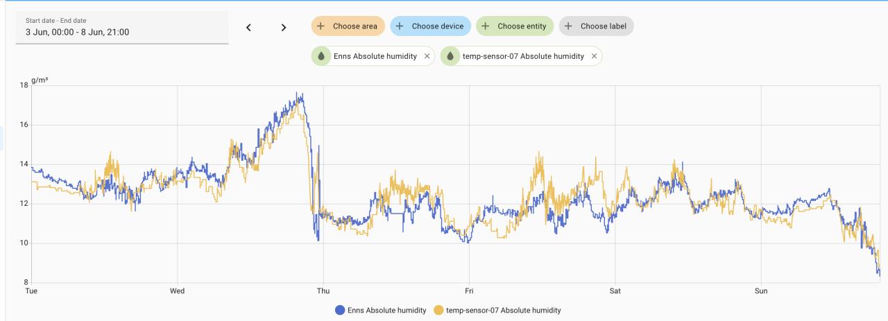 Die typischen Sensoren liefern Temperatur und relative Luftfeuchtigkeit. Daraus kann die absolute Luftfeuchtigkeit oder Taupunkt berechnet werden. In Home Assistant verwende ich dafür folgende Integration: https://github.com/dolezsa/thermal_comfort Also ja, mach ich eh genauso wie du sagst 🙂 Absolute Luftfeuchtigkeit und Taupunkt sind für die Steuerung natürlich gleichwertig. Persönlich bevorzuge ich die absolute Luftfeuchtigkeit; beim Ausleeren vom Entfeuchter hab ich dann zirka ein Gefühl für die Relationen 😅 |