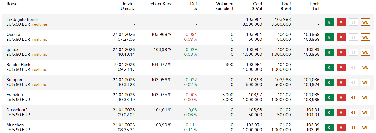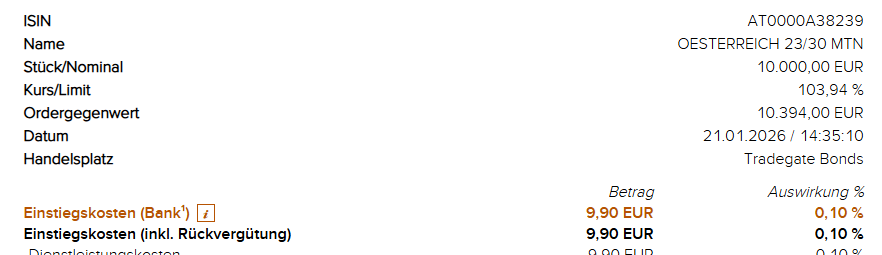 Hab mir das mal mit KI durchrechnen lassen. Ist bei der Anleihe ja gar nicht so einfach (Transaktionsspesen beim Kauf, Kurswert beim Kauf höher als Ausgabepreis, Stückzinsen, aktueller Wert, jährliches Zinsesausschüttung mit KESt-Abfuhr, ....). Da ist der Bundesschatz tats. deutlich einfacher 😂. Aber zumindest lt. KI steigt man bei AT0000A38239 gegenüber 4J-Bundesschatz tats. besser aus, wenn man sie bis zum Ablauf hält. Spiele daher mit dem Gedanken, die Anleihe zu kaufen, da ich gerade bei der Renaultbank 4-Jahres Festgeld rausbekommen habe und dieses erneut für 4 Jahre anlegegn möchte. Aber vielleicht kann mir da noch jemand helfen: Habe bei Flatex bislang ausschließlich ETF-Gratis-Sparpläne gekauft, noch nie aber sowas wie eine Anleihe. Bin daher damit überfordert, wo ich AT0000A38239 kaufen soll, hinsichtlich Geld/Brief/Spread, ... Was wäre z.B. hier im konkreten Fall der best buy und warum? Vielen Dank vorab! 😊 |