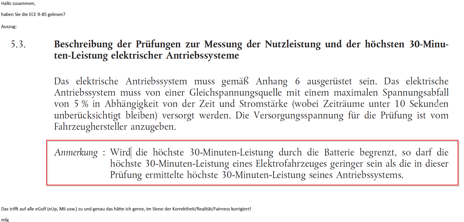 Die Typen wollens nicht verstehen..... ________________________________________________________ Sehr geehrter Herr XXX, Die laut ECE-R 85 (= Regelung für die Genehmigung von Antriebssystemen und Motoren) durchgeführte Leistungsermittlung des E-Motors steht in keinem direkten Zusammenhang mit der Akkukapazität. Dadurch kann es sein, dass z.B. ein E-Fahrzeug zwar 100 kW Nenndauerleistung hat, während der Akku „nur“ eine Kapazität von 32 kWh aufweist. Es ist keine andere Angabe der Leistung nötig, da die angegebene Leistung bei der ECE-R 85-Prüfung festgestellt wurde! Diese Prüfung wird, wie bereits erwähnt, durch eine unabhängige Behörde geleitet und genehmigt. In den anfangs übermittelten Dokumenten (COC-Papier und Einmeldebestätigung), sind korrekte Leistungsangaben angeführt! Mit freundlichen Grüßen Homologation / Typenscheine _____________________________________________________________________ meine Antwort: