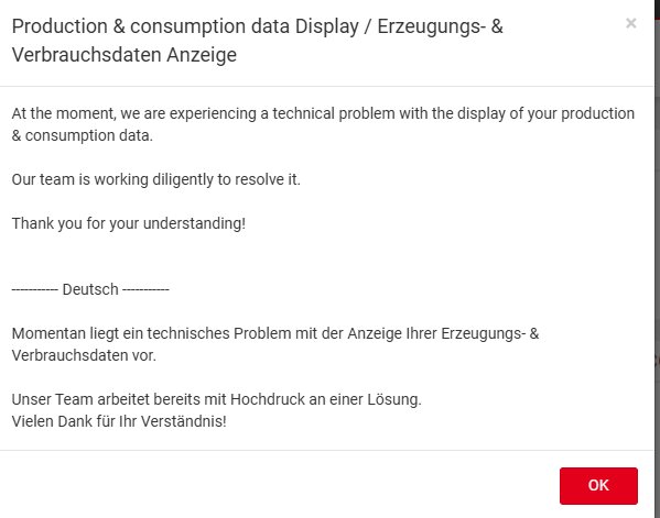 aktuell kommt es zu einer Störung bei den Cloud-Diensten von Microsoft, die wir für die Datenübertragung in Solar.web nutzen. Daher ist die Anzeige der Energiebilanz-Daten derzeit leider eingeschränkt.