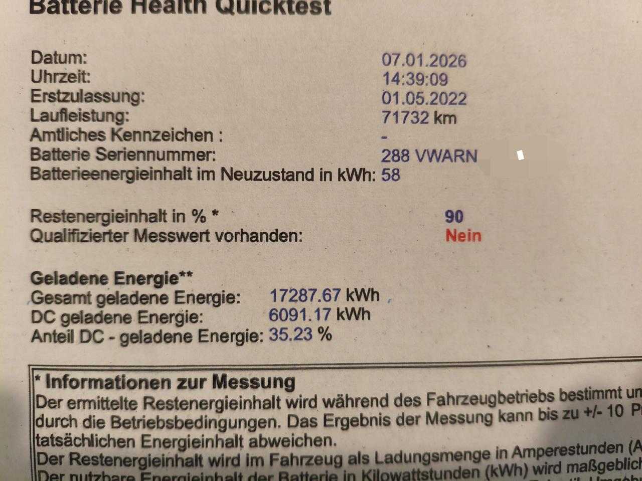 Meiner weist mit EZ 03/2022 und rund 60tkm einen SoH-Wert mit dem Quicktest von 100% aus. Vielleicht 5-7x am Schnelllader, Vorbesitzer hab' ich jetzt nicht im Kopf, kann aber mit dem Wert auch nicht wirklich oft am HPC gestanden sein. DC-Energie mit einem Drittel ist halt nicht nichts und wird den ausgewiesenen Wert widerspiegeln. Info: der Health-Qicktest hat eine Schwankungsbreite von +/- 5%. Der gepostete Enyaq hat von Haus aus schon die kleine Batterie, dazu max. 90% SoH, vielleicht sogar darunter. Ich würde den nicht nehmen. |