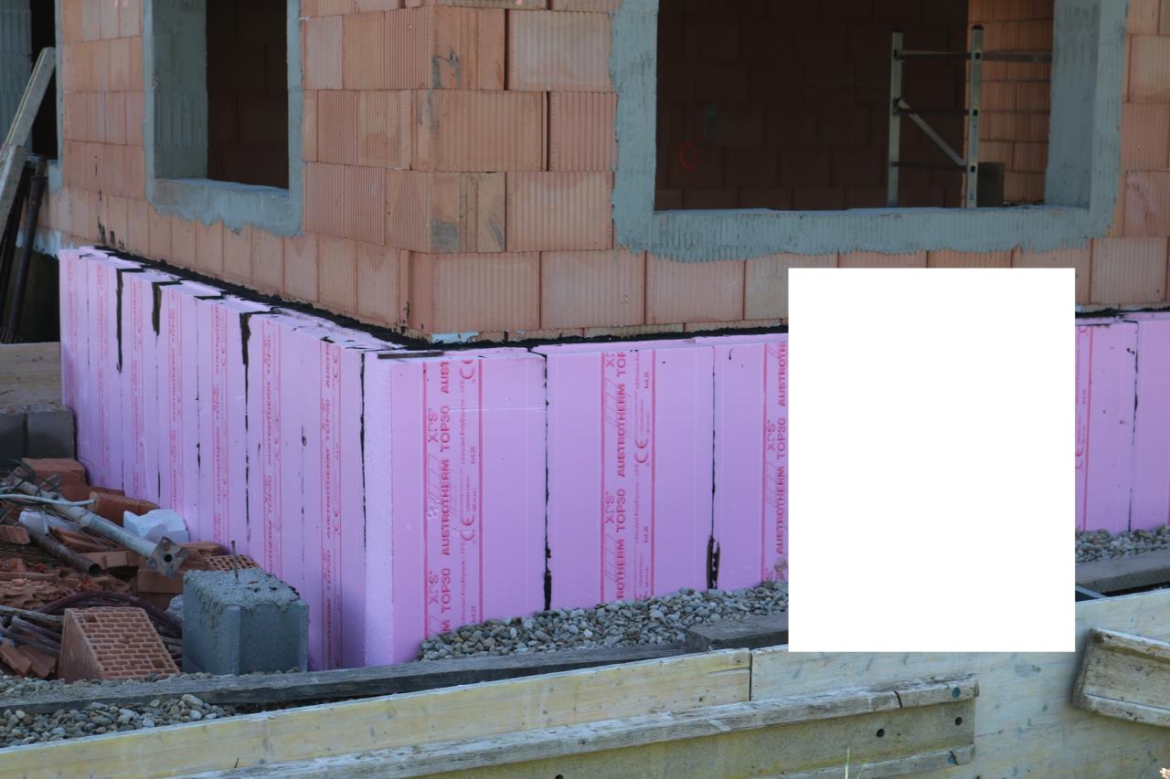 Im Bereich der Terrasse wurde von uns (Eigenleistung) XPS mit KMB aufgeklebt bevor die Terrasse anbetoniert wurde (statisch nicht mit dem Haus verbunden, Beton direkt an XPS Platte):