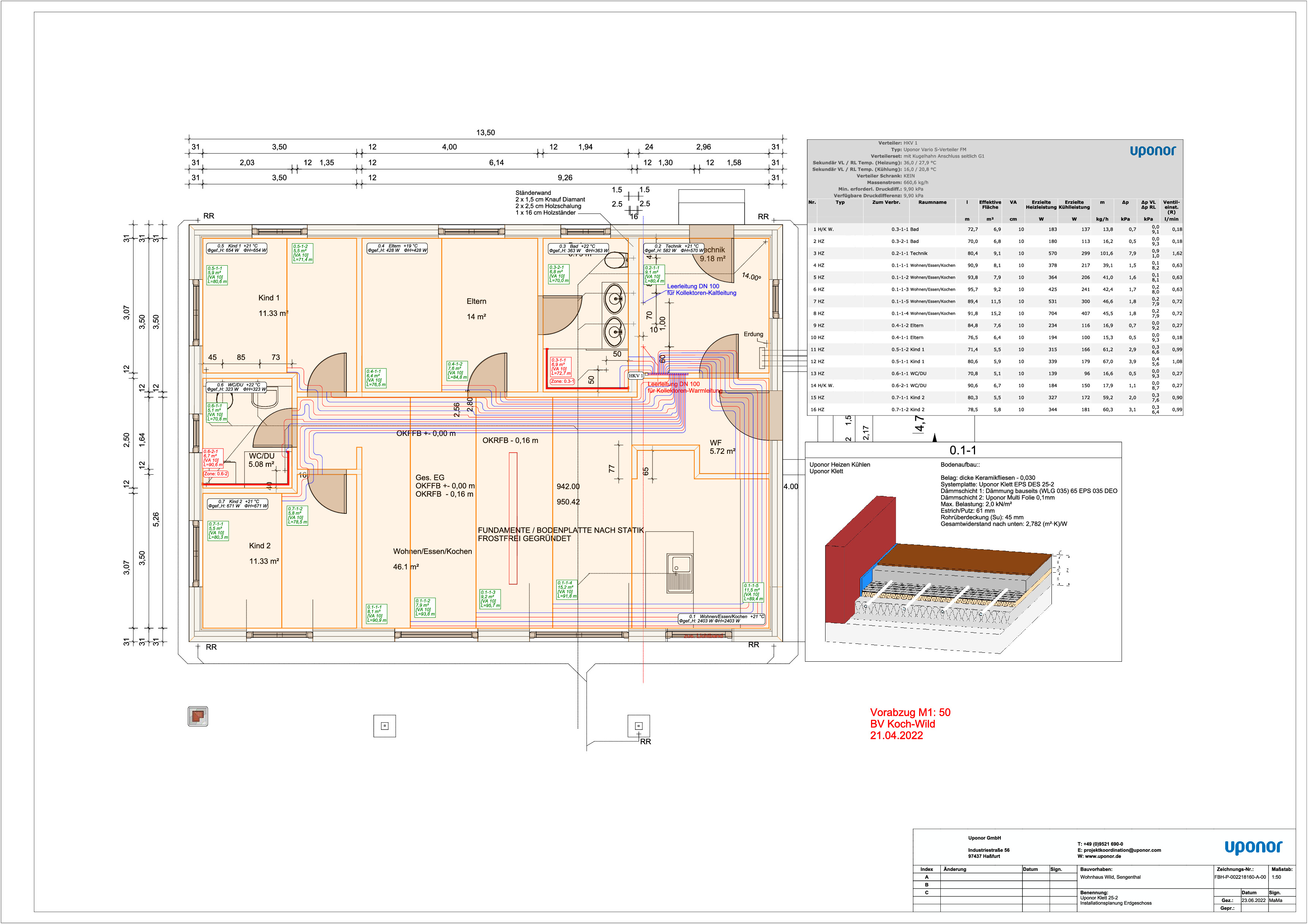 ergänzend zu den ganzen korrekten kommentaren... die software hat hier wieder mal jemand befüllt der offensichtlich noch nie eine flächenheizung aus der nähe gesehen hat. 13 K spreizung vorlauf/rücklauf sind völlig grotesk. wir heizen hier ja nicht mit lagerfeuer. wp sind high-flow systeme, flächenheizungen auf maximal 5 K auszulegen. in kombination mit bauteilaktivierung auch auf 3-4 K... 9 grad temperaturunterschied zwischen benachbarten räumen sind völlig grotesk. shit in shit out... daß ein renommierter installationsbetrieb sowas durchwinkt ist einfach traurig... |