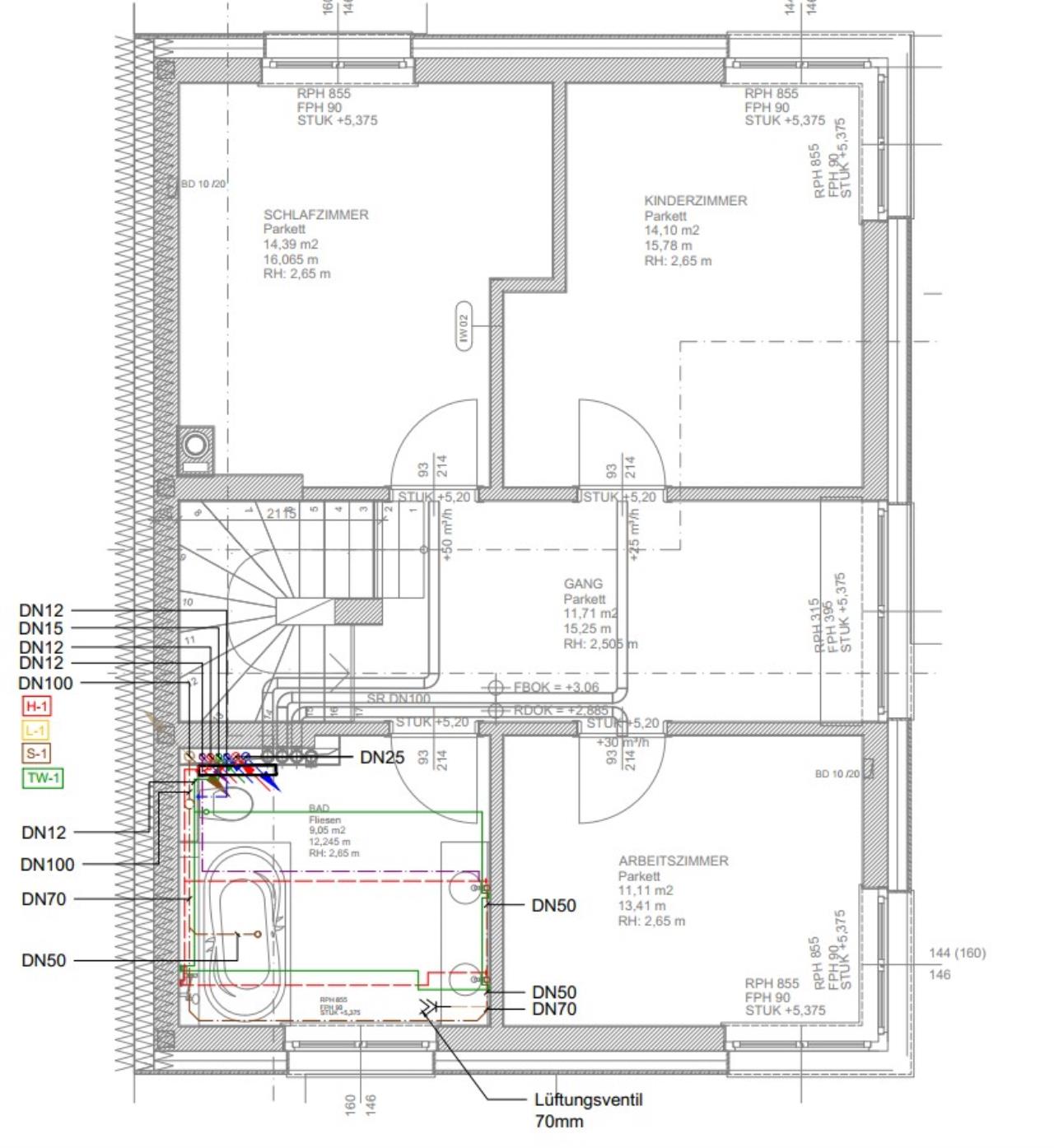 Den Kanal von der Küche wäre nach Büro ursprünglich in einem eigenen Strang zusammengefasst und aus dem Keller geführt worden, ich wollte nur weniger Wanddurchbrüche im Keller machen, weshalb ich nun das Abwasser der Küche an der Kellerdecke installiere (über der Sauna und im Vorratsraum auch nicht störend bzw. gut versteckbar) und mit dem Fallstrang von WC zusammenfasse