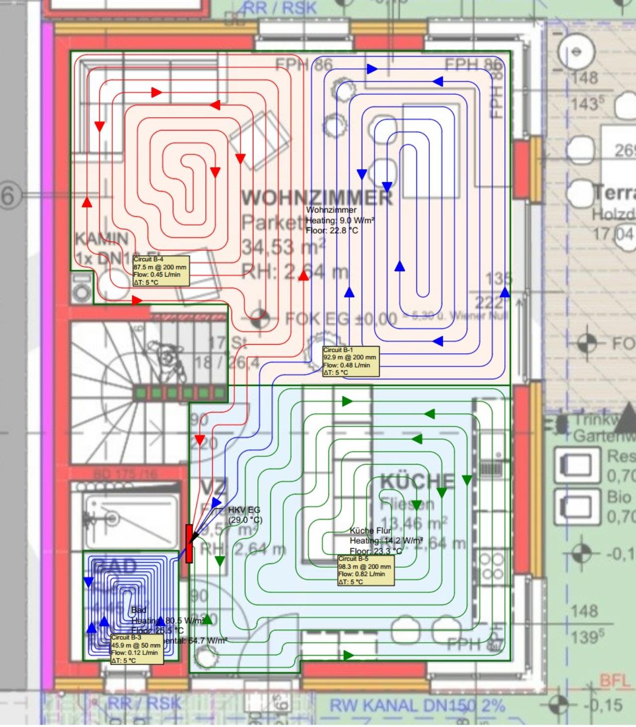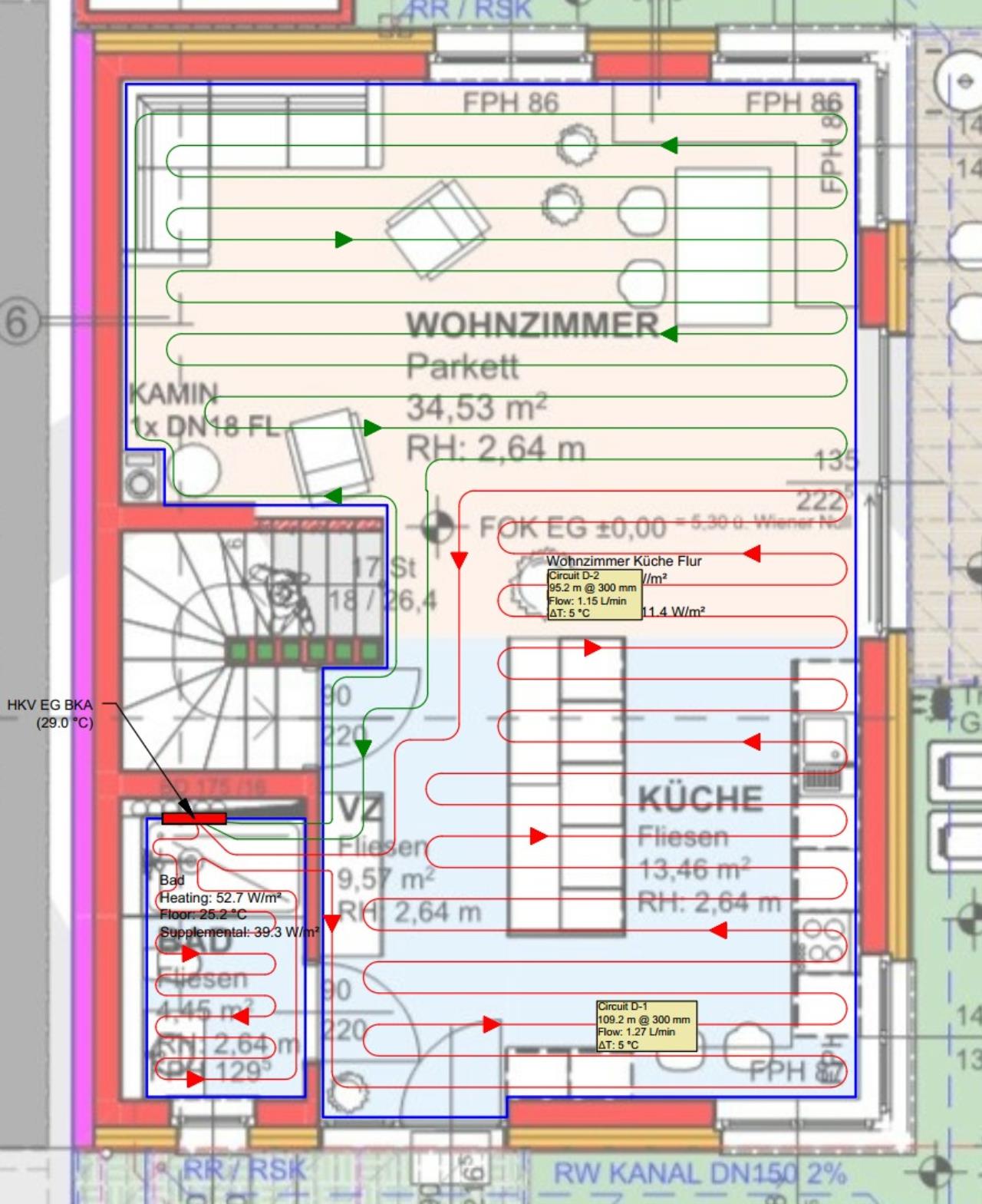 Die BKA BKA [Betonkernaktivierung] im OG Bad ist mit der falschen Flussrichtung geplant. Außerdem bringt diese mit dem großen Verlegeabstand in diesem Bereich nichts. Kleinere Rohrdimension und engerer Verlegeabstand nur für diesen Bereich, dann wäre es sinnvoll gelöst.