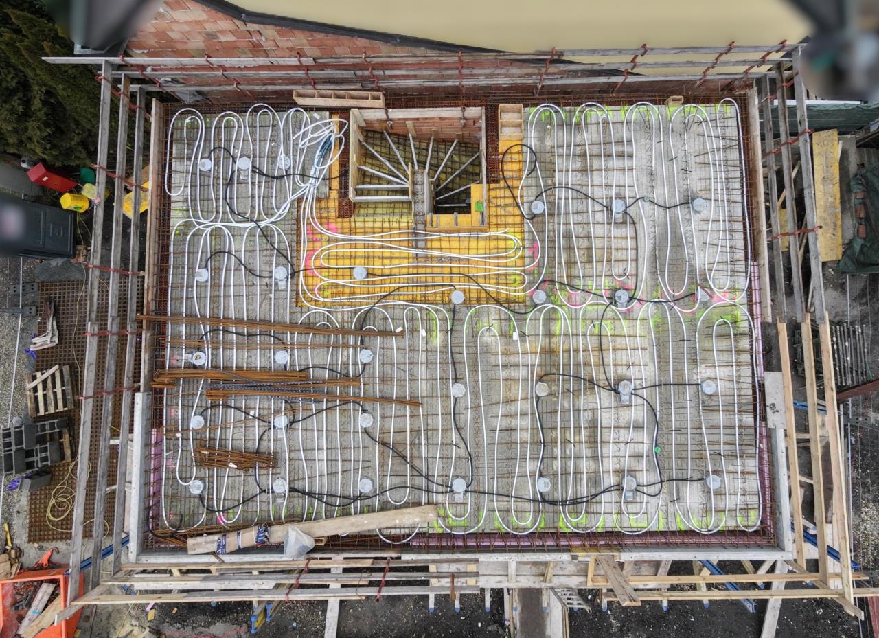 Ich habe mich zwecks Einfachheit für eine etwas andere Verlegetechnik der BKA BKA [Betonkernaktivierung] Leitungen entschieden - dabei waren keine so engen Biegungen notwendig. (Siehe Aufnahme)