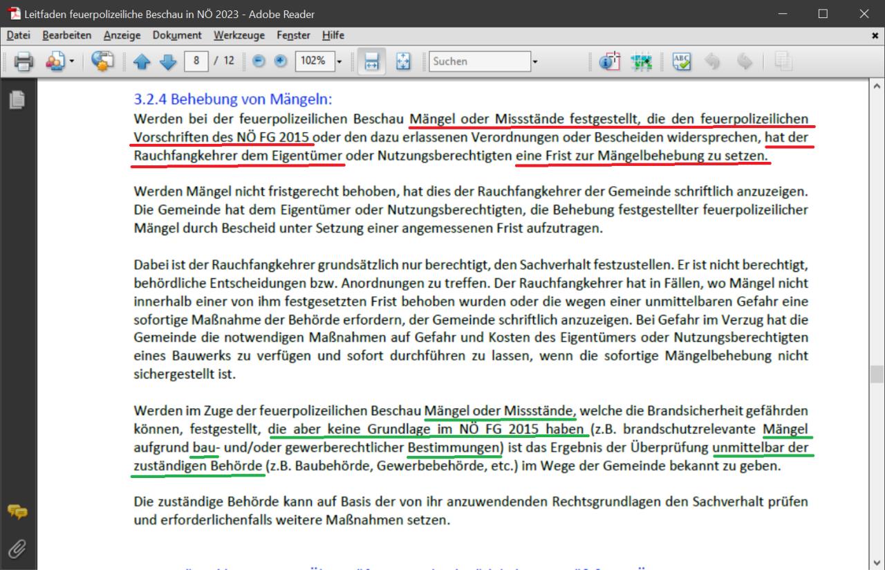 Betreffend dem Beschau habe ich einen Leitfaden gefunden: Nachdem der Rauchfangkehrer eine Frist gesetzt hat, sind es Mängel nach dem NÖ FG 2015. Mängel nach anderen Vorschriften (z.B. Bauordnung) hätte er ja sofort der Behörde bekannt geben müssen. Betreffend Feuerlöscher bereithalten finde ich im NÖ FG 2015 nur §24 der aber nicht für Wohnhäuser mit weniger als 5 Stockwerken gilt. Darunter fallen doch auch Einfamilienhäuser, oder? Ok, es ist eine Garage, also vielleicht Abs (1)- Pkt 2 jedoch habe ich keinen durch Bescheid der Gemeinde vorgeschrieben, auch nicht im Plan. Will er hier den Bauakt neu aufrollen und die Gemeinde dazu bringen jeden einen Feuerlöscher vorzuschreiben? Nach NÖ FG 2015, §6 könnte man für alle Gebäude einen Blitzschutz fordern und noch vieles mehr – z.B. keinen Holzfußboden, Teppich, etc. – alles was brennen kann ergibt eine Brandgefahr, oder? Wenn der Gesetzgeber dass so wünscht, warum hat er es dann nicht gleich in der Bauordnung gefordert? Den angegebenen Mangel bei der Kanalentlüftung geht aber nicht über §6, denn so weit ich das verstehe wirkt das nur wenn es schon brennt, also §6 bereits vorbei. NÖ FG 2015, §14 Abs (1) Pkt 2 kann so gelesen werden: Die feuerpolizeiliche Beschau dient der Feststellung von Zuständen, die die Brandbekämpfung erschweren können. Damit kann man jetzt auch viel fordern. Alles kann in einer bestimmten Situation eine Brandbekämpfung erschweren, auch ein Spielzeugauto auf dem ein Feuerwehrmann ausrutscht. Also keine Autos mehr zum Spielen für die Kinder, oder? NÖ FG 2015, §14 Abs (3) letzter Satzteil: … oder sonstige Mängel oder Missstände, die die Brandsicherheit gefährden können, vorliegen. Auch damit kann man viel fordern. Leider sind die Begriffe Brandsicherheit, Mangel und Missstand im Gesetz nicht definiert also alles rein subjektiv und willkürlich. Irgendwie verstehe ich den Gesetzgeber nicht, wenn das Feuerwehrgesetz ohnehin die Bauordnung schlägt, weil man sich darauf nicht mehr berufen kann, warum wird der Brandschutz dann überhaupt dort noch behandelt? Wenn es im Feuerwehrgesetz wäre könnte ich mich darauf berufen im Sinne einer näheren Bestimmung was unter den allgemeinen Phrasen zu verstehen ist. |
