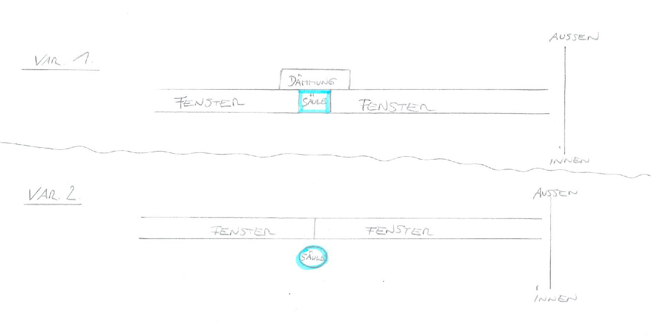 Wir haben eine relativ große Fensterfront, bei der 2 Elemente einer bodentiefen Fixverglasung aufeinandertreffen. Wir benötigen an dieser Stelle aus statischen Gründen eine Säule. In meiner laienhaften Vorstellung hätte ich die Säule einfach außenbündig zwischen die Elemente gesetzt bzw. betoniert und außen "normal" mit der Dämmung die Säule und die Rahmen überdämmt (Variante 1).