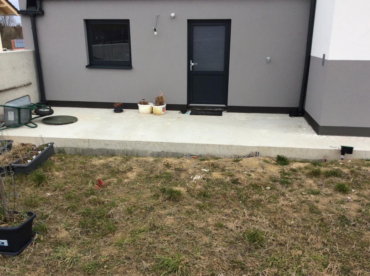 Zwischen Terrasse und Wiese haben wir einen ca. 25cm schmalen Schotterstreifen, hier kommt aber noch ein Drainrohr rein dass in den Kanal mündet.