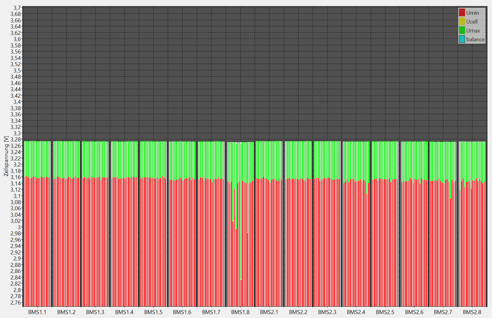 Woraus ich auch nciht ganz schlau werde: die cyanen Balancing-Balken bei den Zellen... logisch wäre dass bei diesen Zellen gerade Balancing aktiv ist, aber das macht für mich bei den Zellspannungen irgendwie keinen Sinn... oder interpretiere ich das ganz falsch?